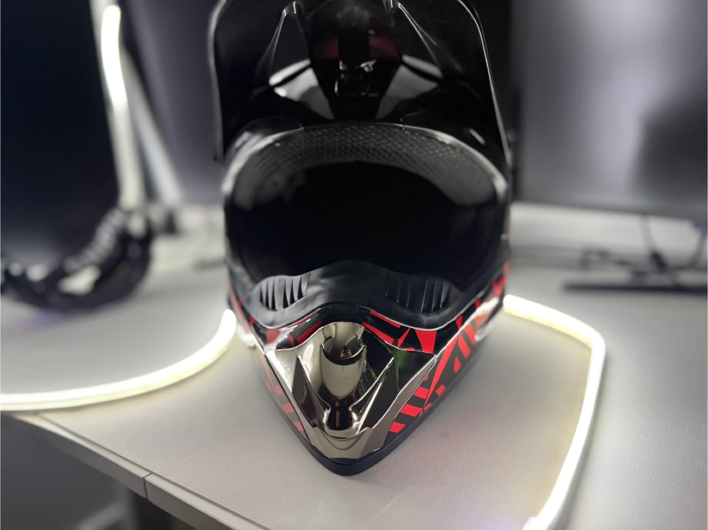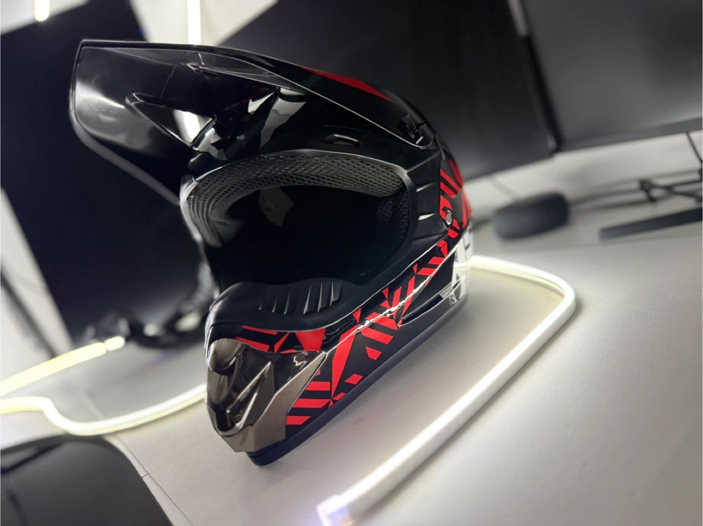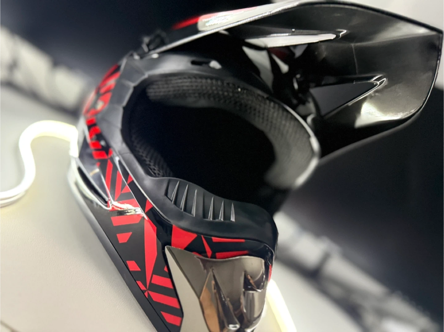 Selling a motocross helmet in black and red. It looks to be in great shape and has a cool design. Perfect for hitting the trails!