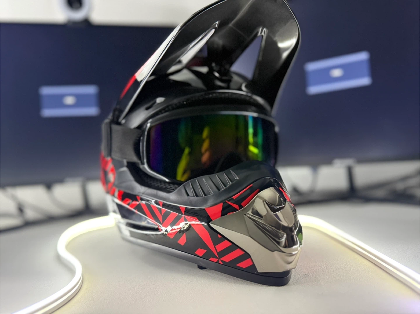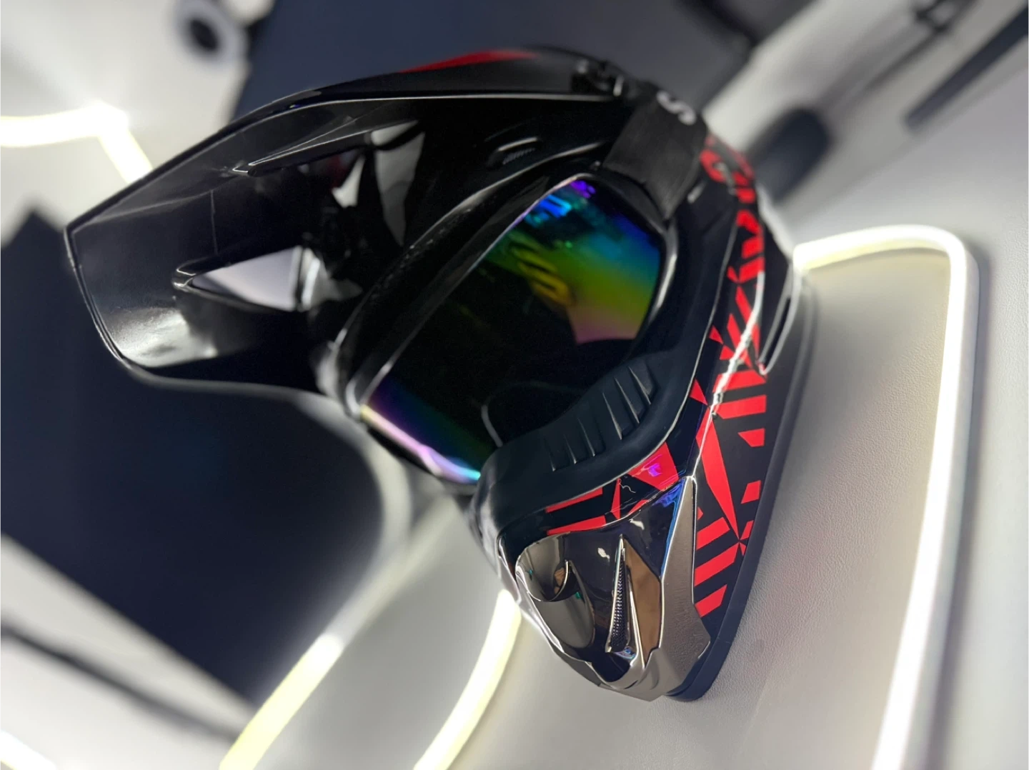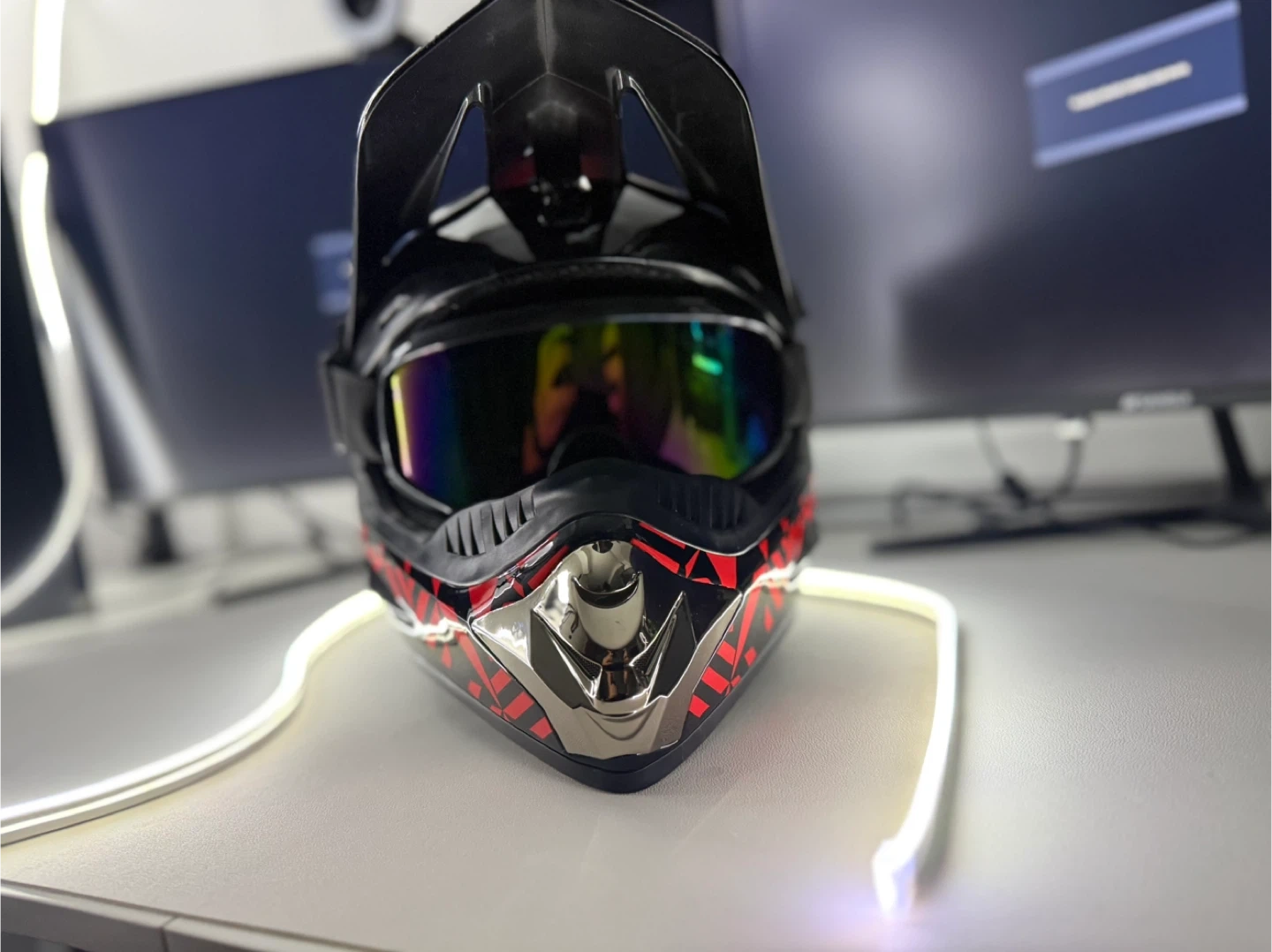 Selling a motocross helmet in black and red. It looks to be in great shape and has a cool design. Perfect for hitting the trails!
