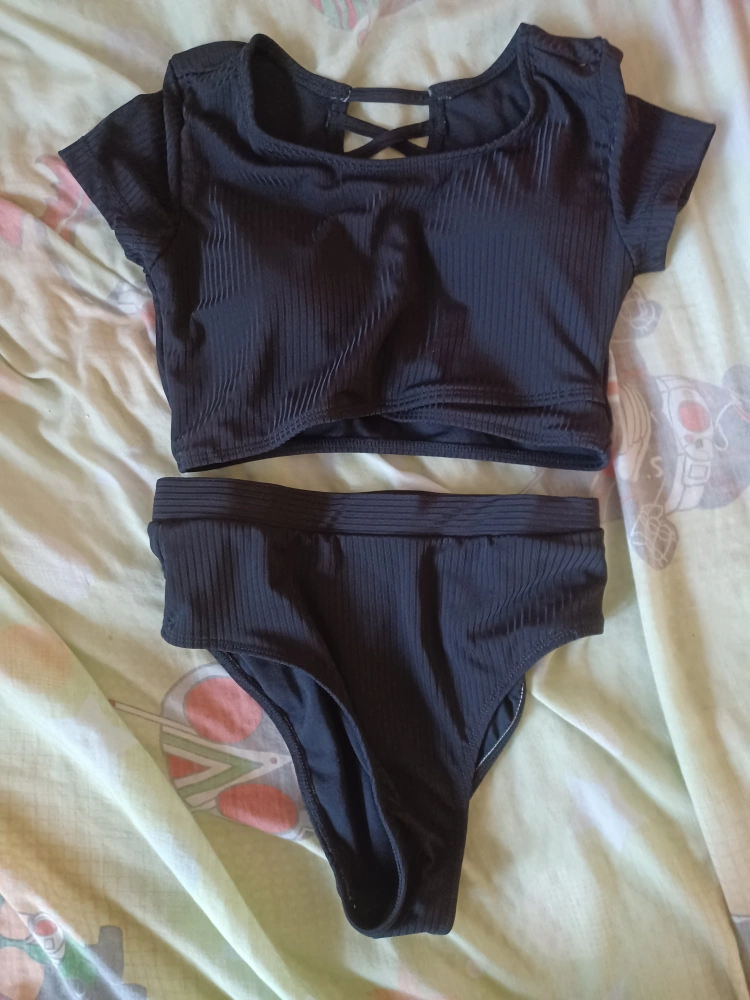 60Selling a cute black ribbed two-piece swimsuit. It features a short-sleeved top with a criss-cross back detail and high-waisted bottoms. Perfect for the beach or pool! size medium 10/12