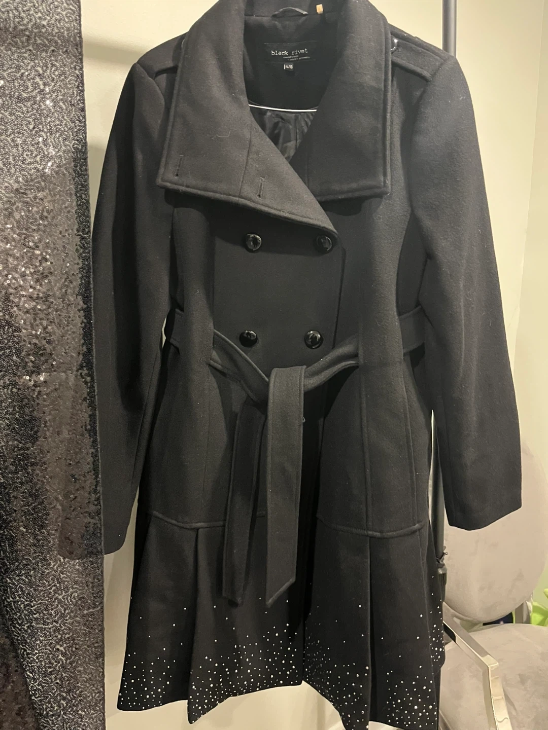 Selling a Black Rivet wool blend coat in size XL. It's a stylish black colour and features a belted waist. Perfect for staying warm and fashionable! Beautiful pleated detail around hem of coat