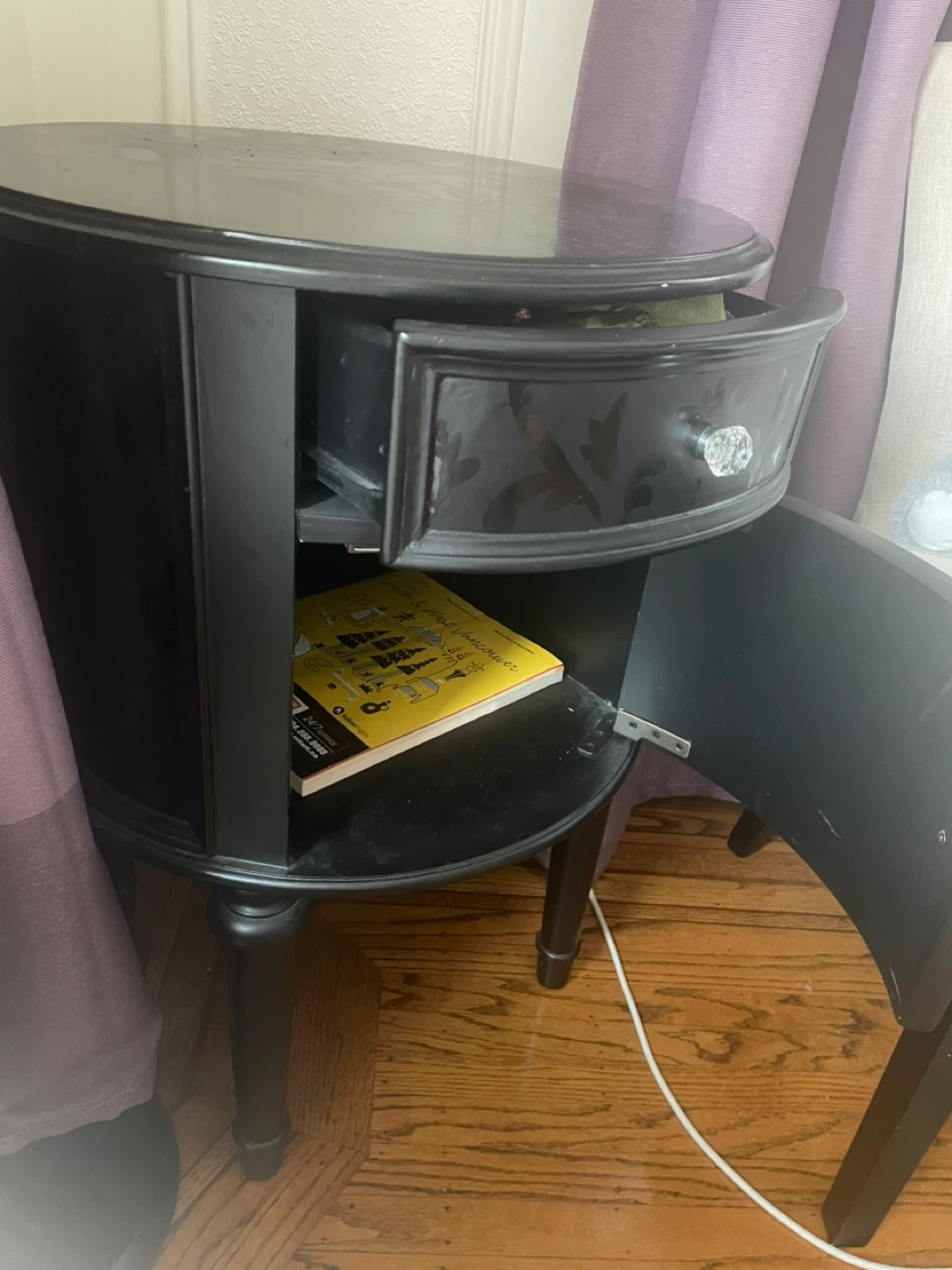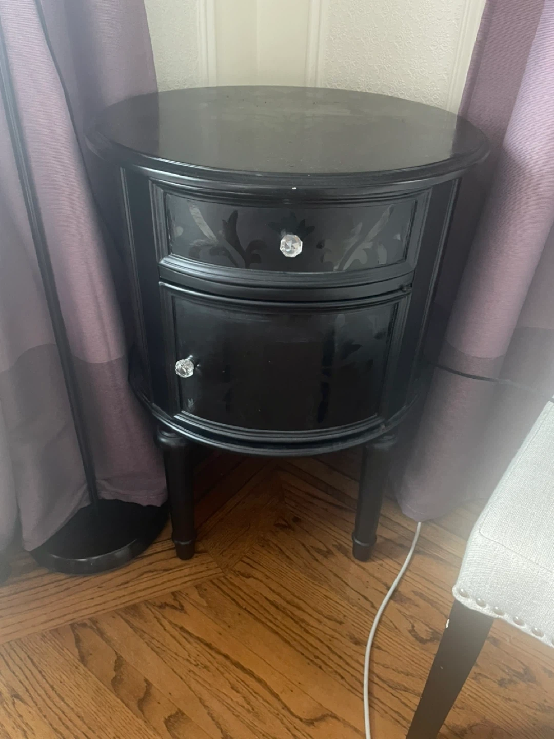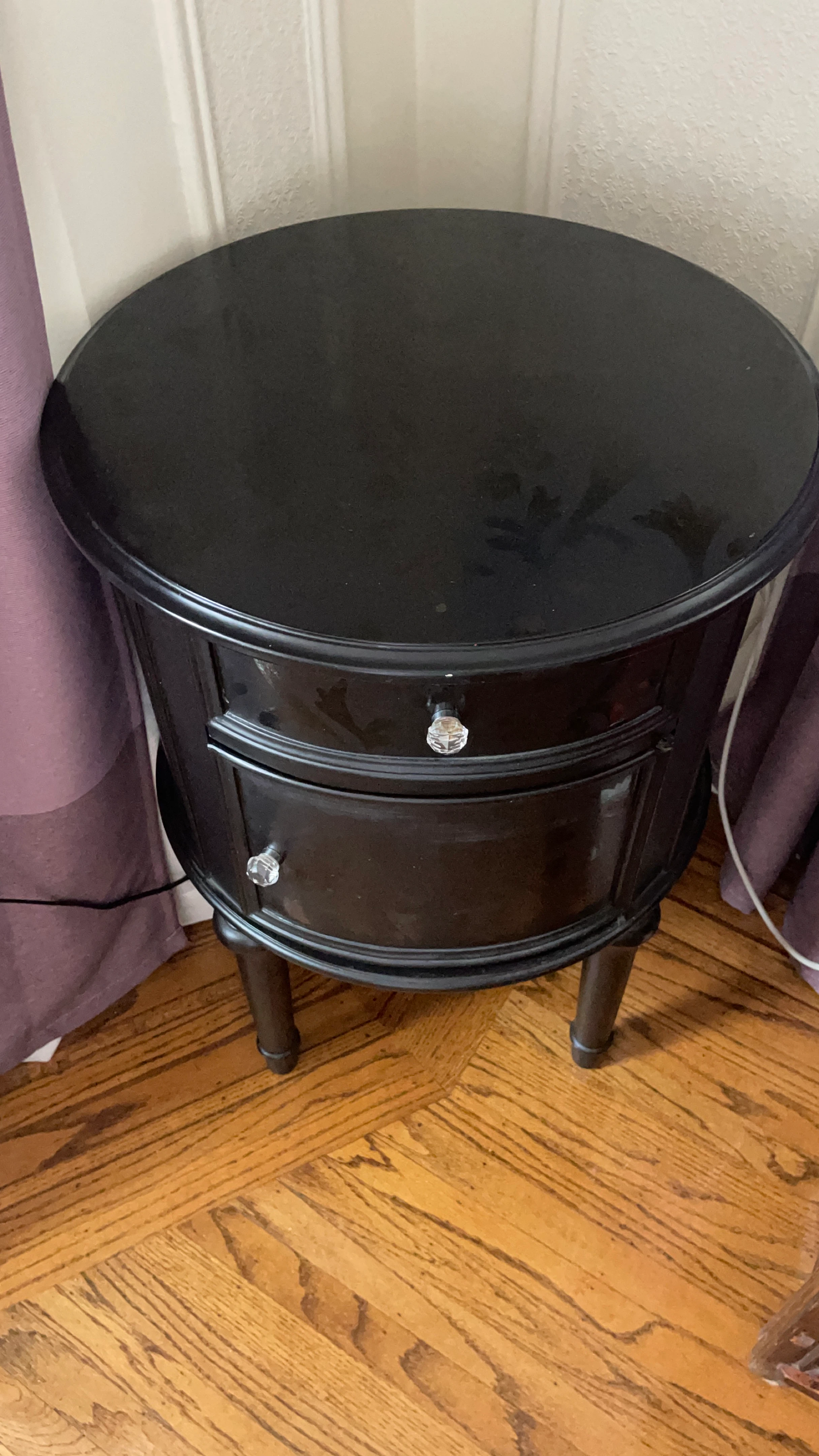 10Selling a cute round side table! It's black and has drawers for storage. The table also has a cabinet space for extra storage. It's perfect for a bedside table or as an accent piece in your living room.