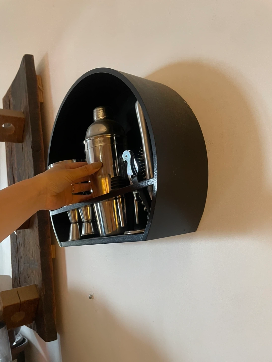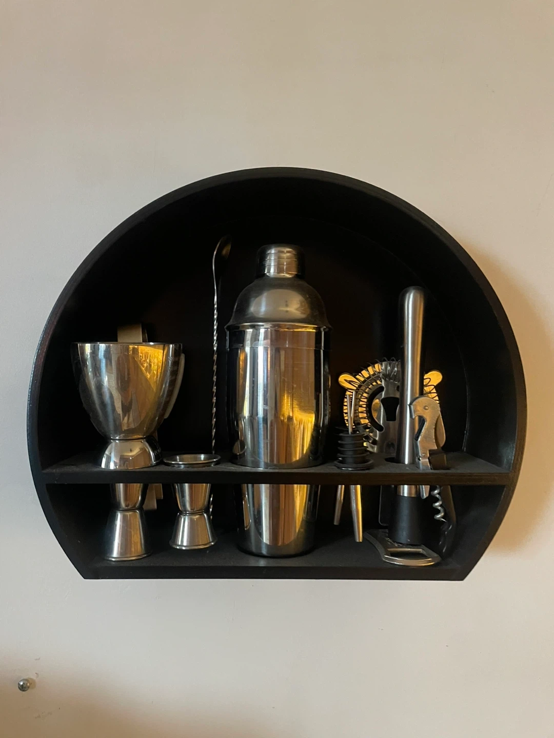 435Selling a stylish black round wall shelf, perfect for displaying your bar tools or other decorative items. It comes with a variety of stainless steel bar tools, including a cocktail shaker, jigger, strainer, and more. This shelf is a great way to add a touch of modern flair to your home bar or living space, while keeping your essentials organized.