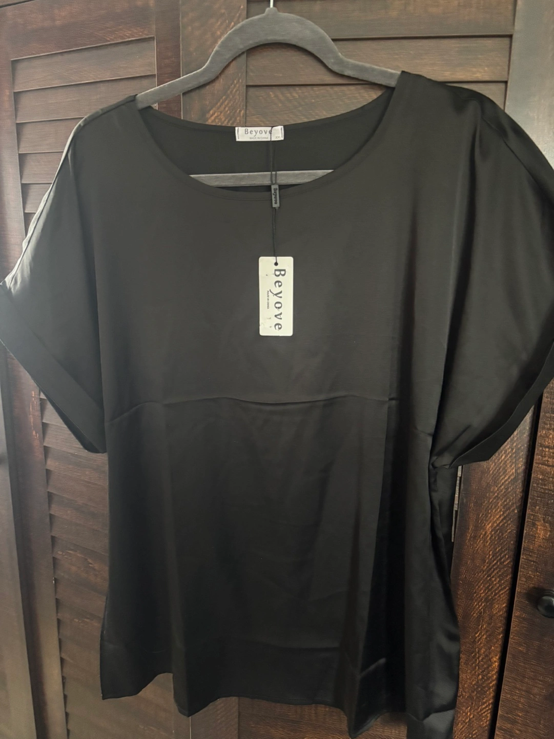 Black Satin Top. Cap sleeves. Relaxed fit. Perfect for layering or wearing alone. Brand New Tags On