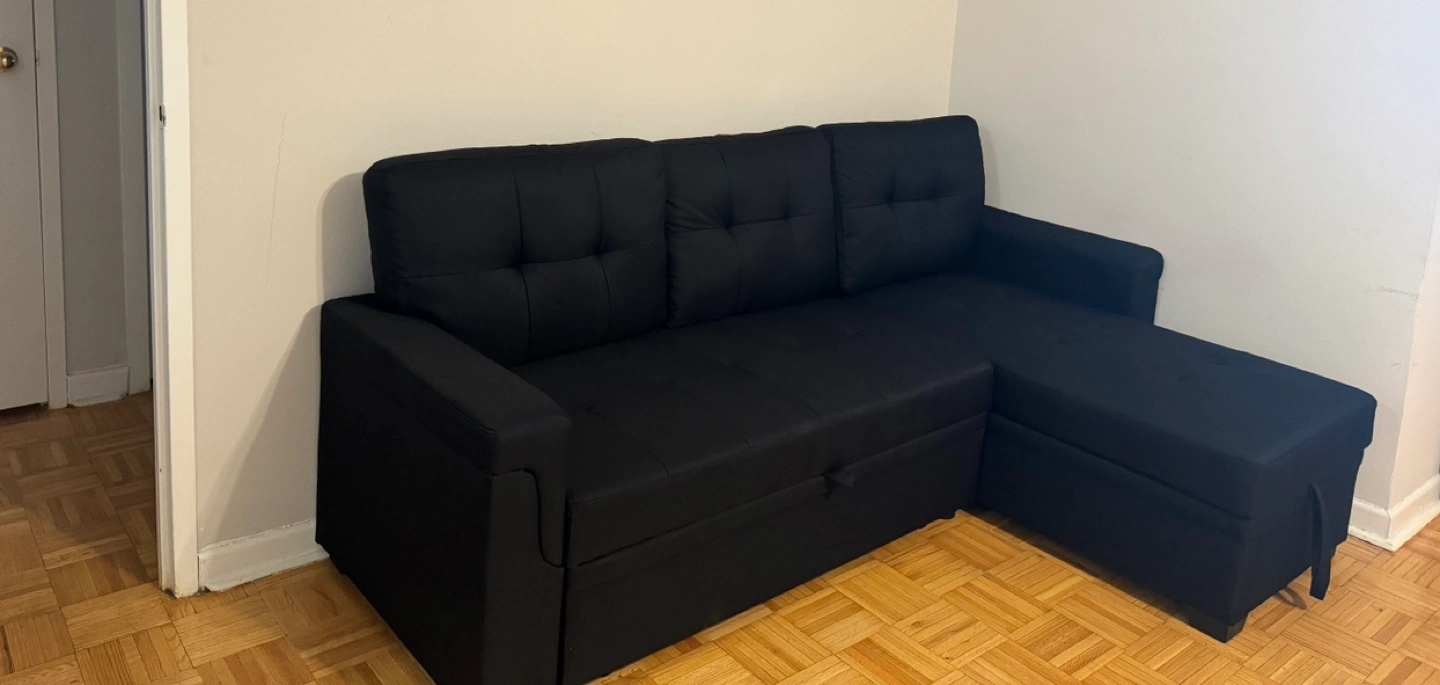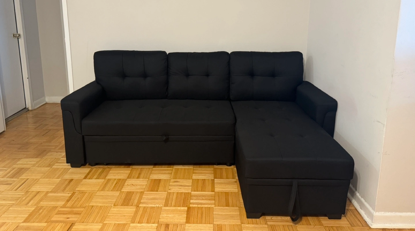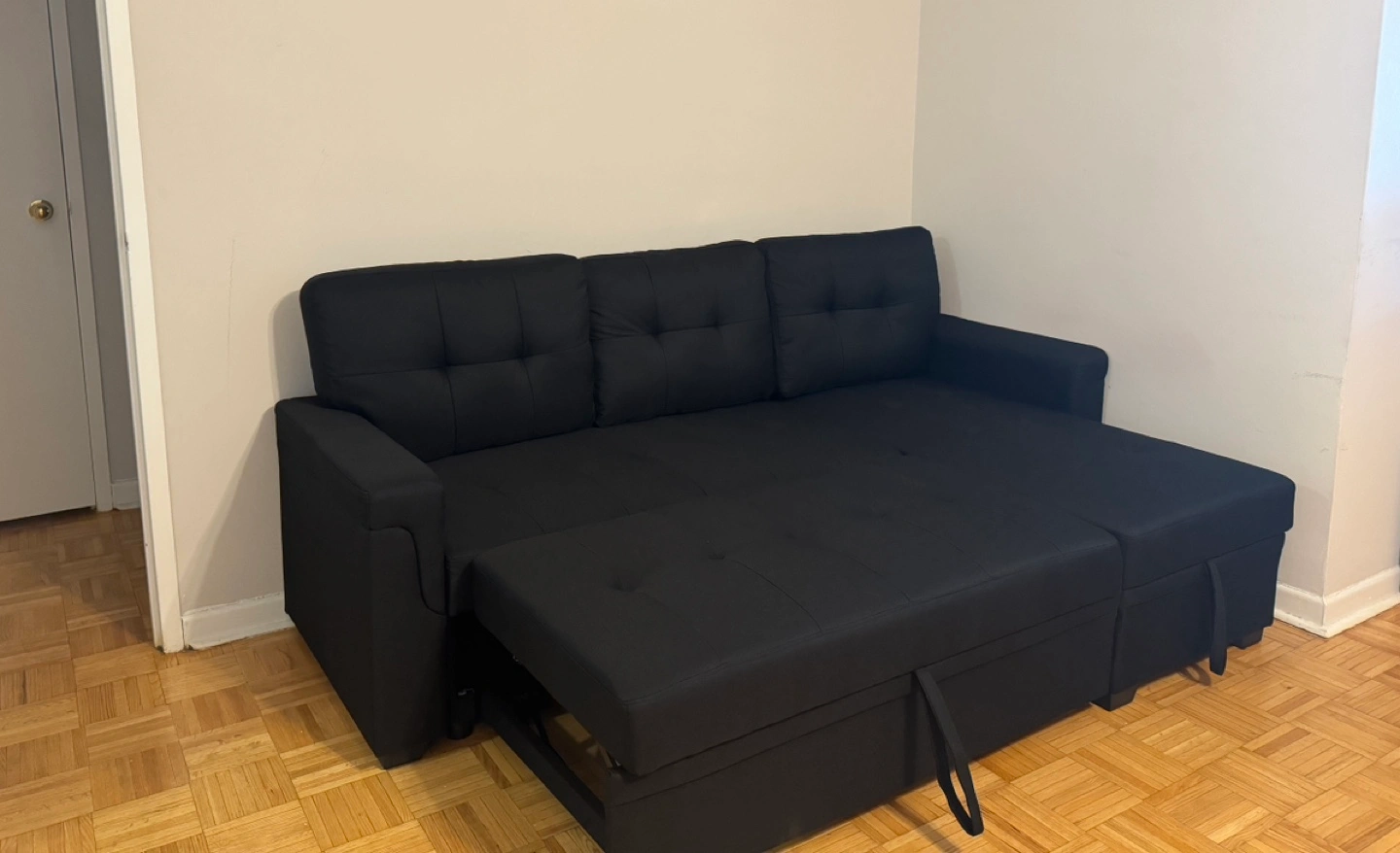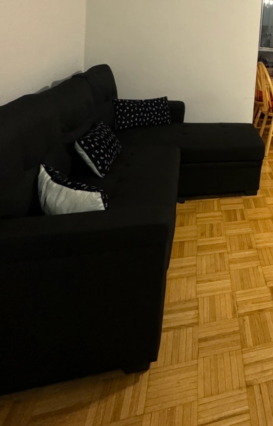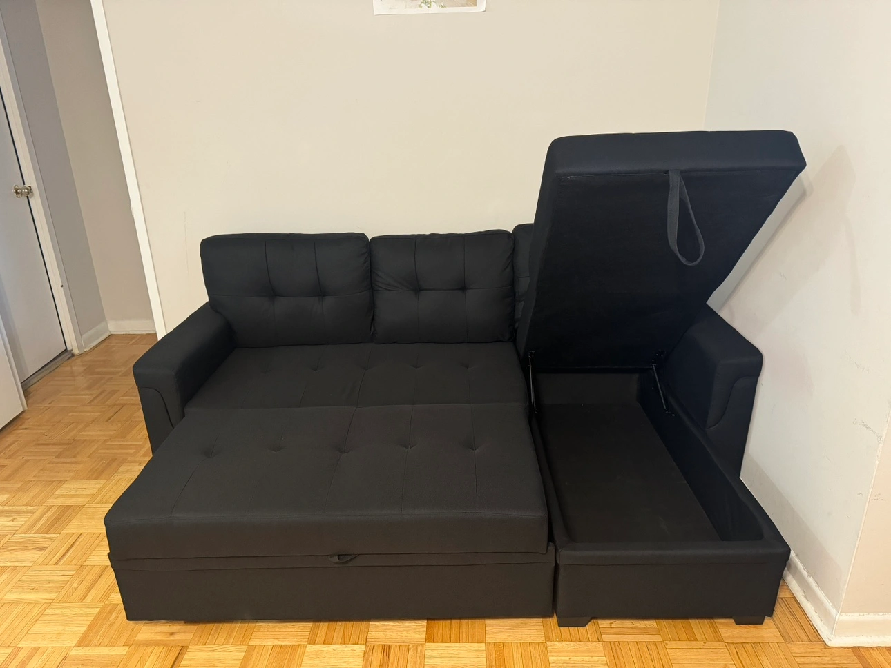 94Black sectional sofa bed with storage. Almost new. Price negotiable. Please note,You have to collect it by your own. This linen-like fabric sofa bed is perfect for family movie nights or hosting classy cocktail parties. The perfect centerpiece for your seating arrangement, it blends contemporary appeal with simple sophistication. The upholstery is accented with jumbo stitch detailing and a tufted accent for a refined yet understated look. Details • Leg Material: Plastic • Cushion Construction: Foam • Upholstery Material: Polyester • Sofa Design: Modular • Assembly Required: Yes Minor stich issue