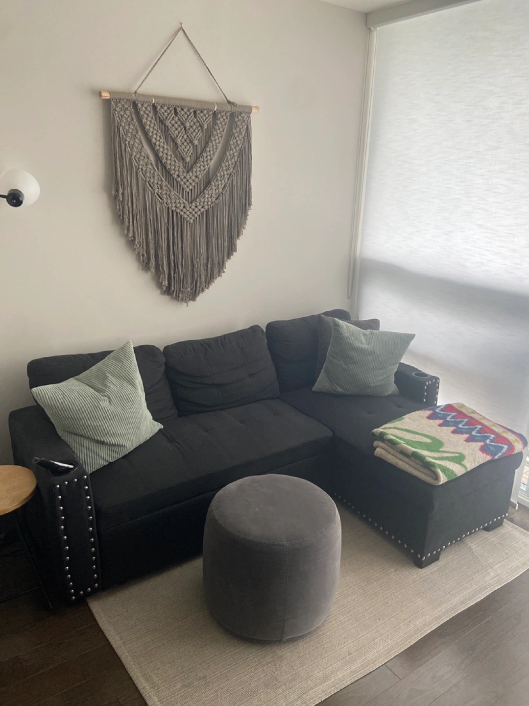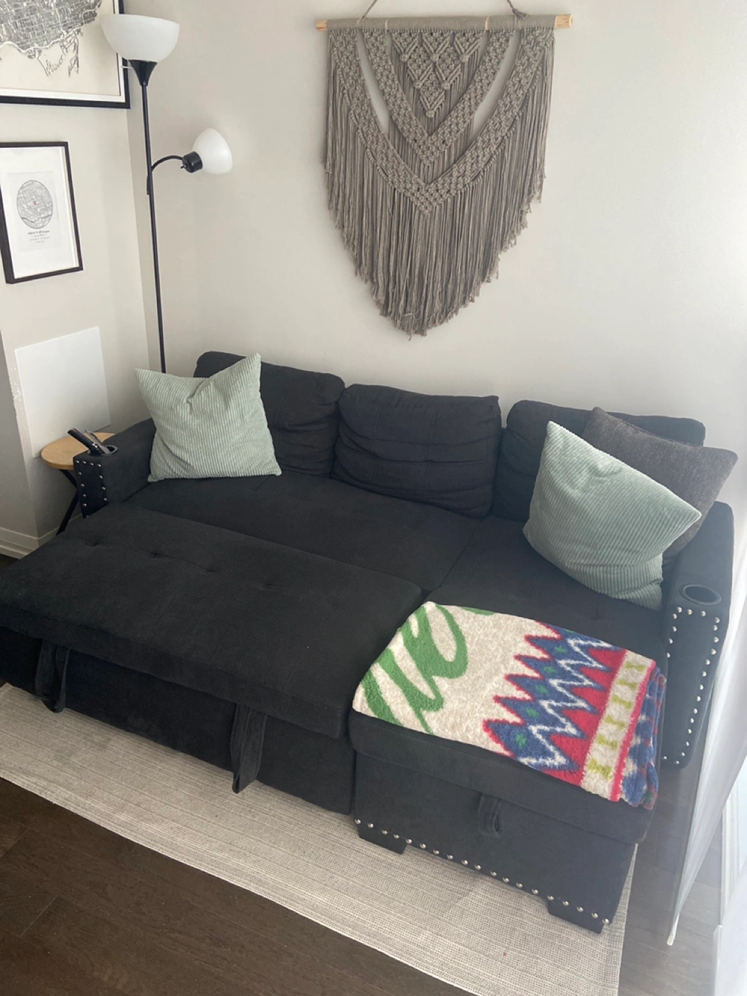 Comfortable black/dark grey fabric sectional sofa. Features a pull-out chaise and bed with storage. Metal stud detailing. PICK UP ONLY. Pillows not included.