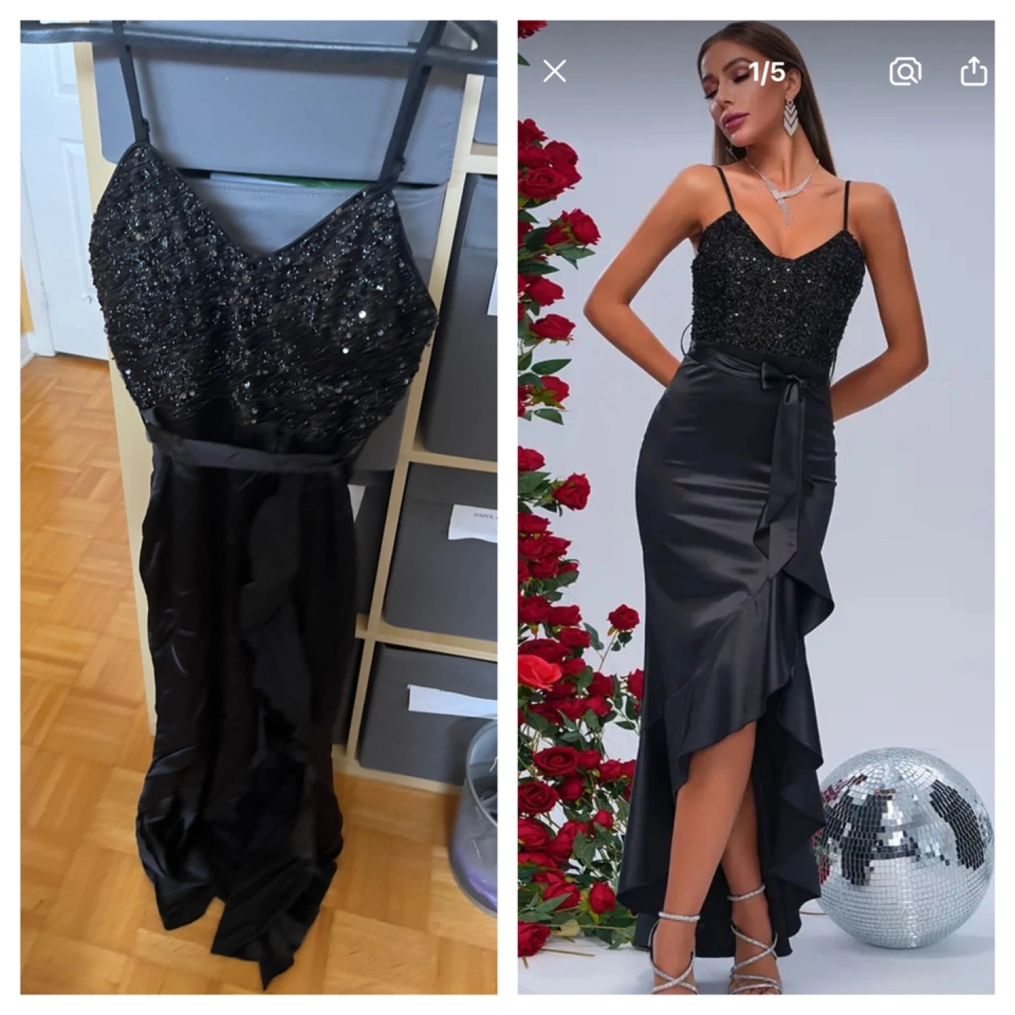 Stunning black dress. Features a sequined bodice and satin midi skirt. High-low hemline. Perfect for a special occasion. unfortunately, this is a small fit so I would say it’s a small rather than a medium fit