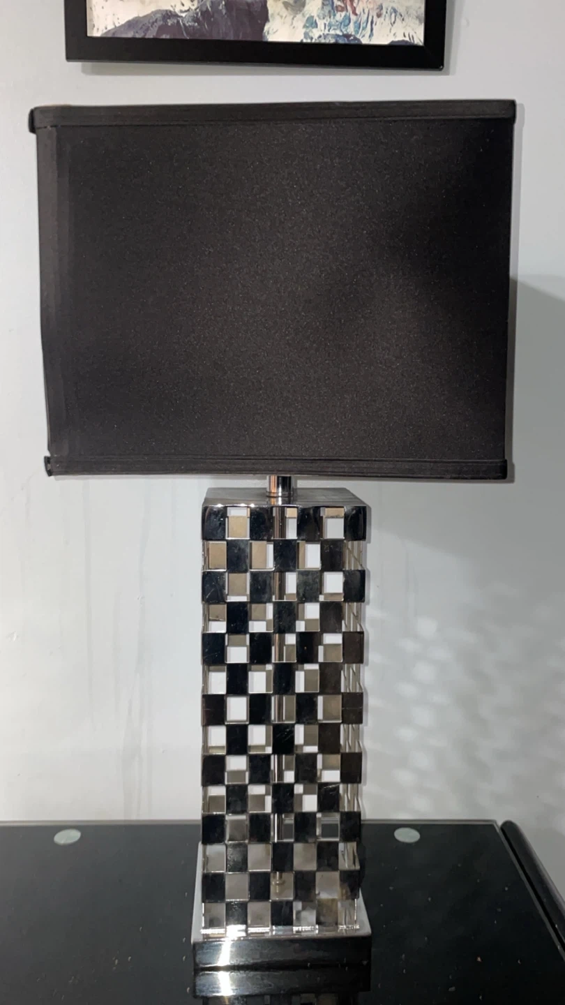 Selling a table lamp with a black shade and a silver/chrome base with a checkered pattern. It's in great condition and would look lovely in any room! I have two of them, for both $40!
