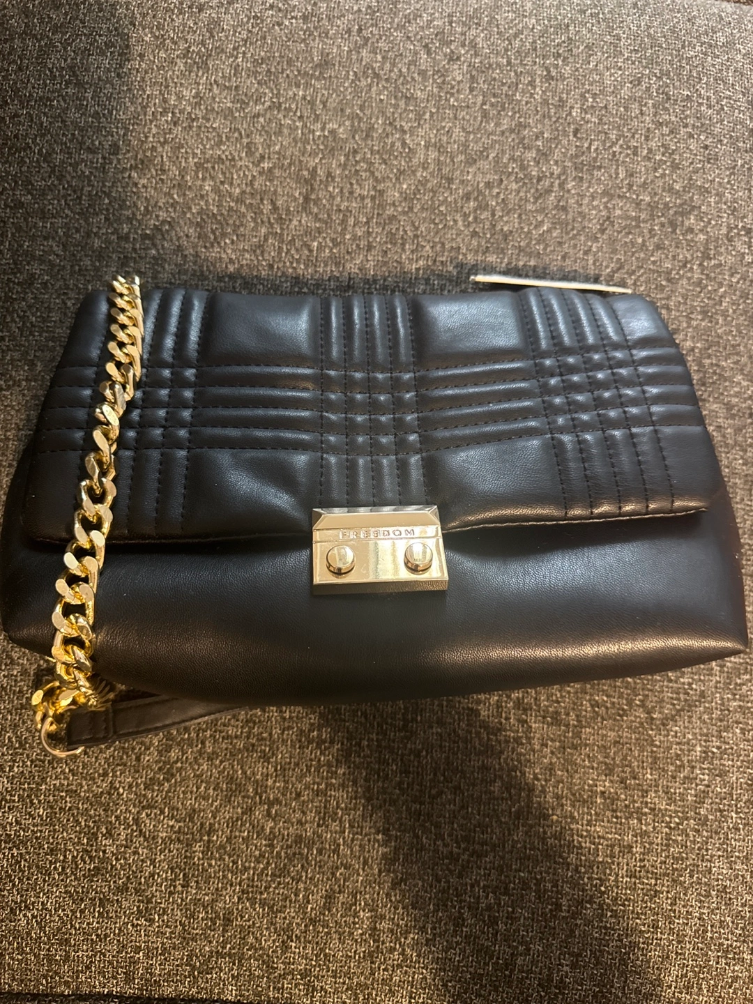 Selling a Freedom shoulder bag in black. It features a gold chain and a quilted design. Perfect for a night out or everyday use!