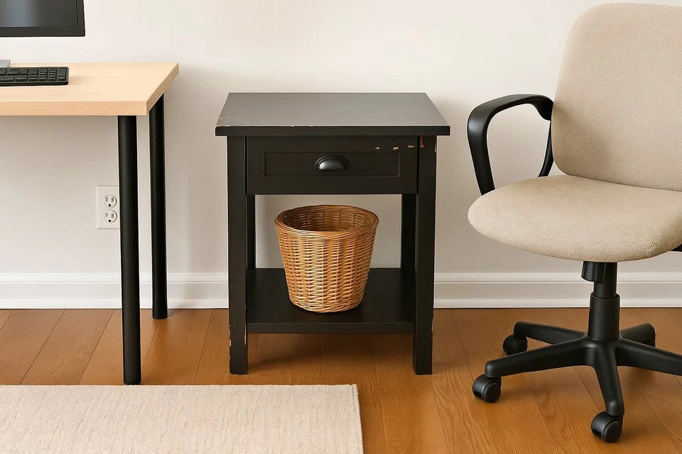 60Functional black side table made of sturdy particle board, approx. 28–30” tall and 24” wide/deep. Comes with one pull-out drawer and a bottom shelf (basket included if desired). Some cosmetic wear and small chips, but still strong and practical. Great for use as a nightstand or desk-side table in your home office.