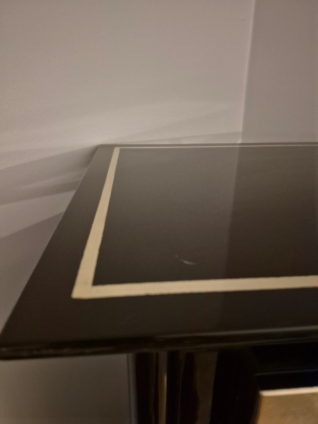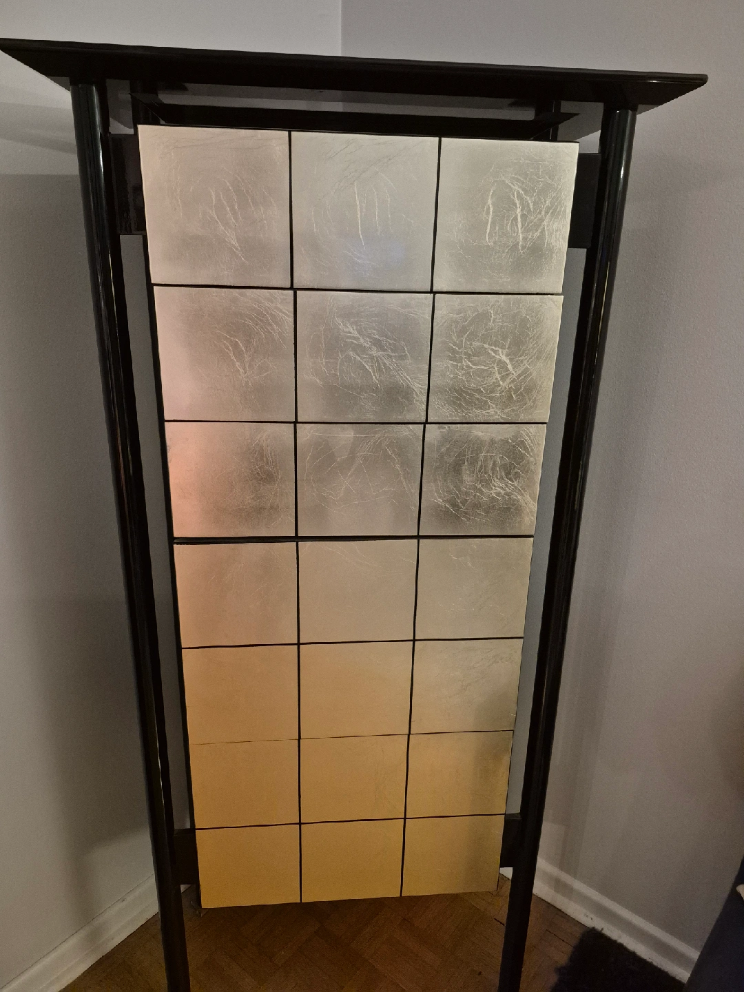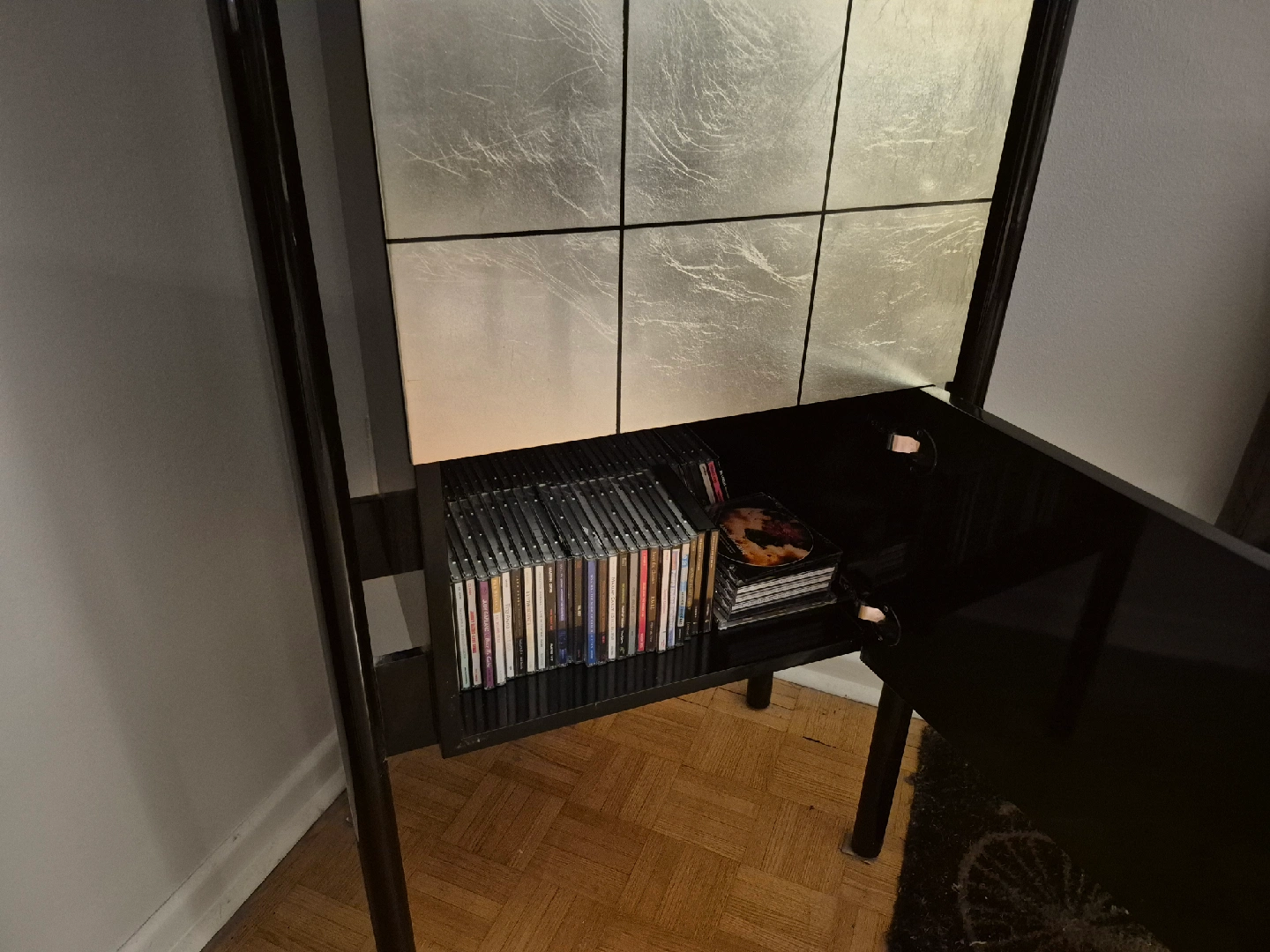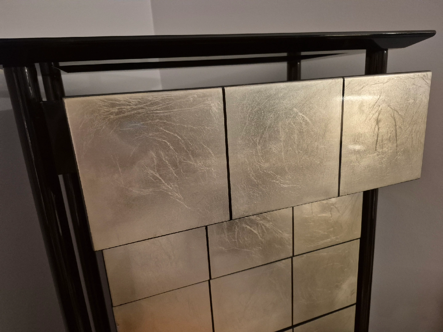 10Selling a unique cupboard! It could also be used as a bar. The piece features a black frame with silver-toned square accents on the front. It has a sleek and modern design that would add a touch of elegance to any room 3 upper drawers and 1 lower solid laquer construction cash only $125