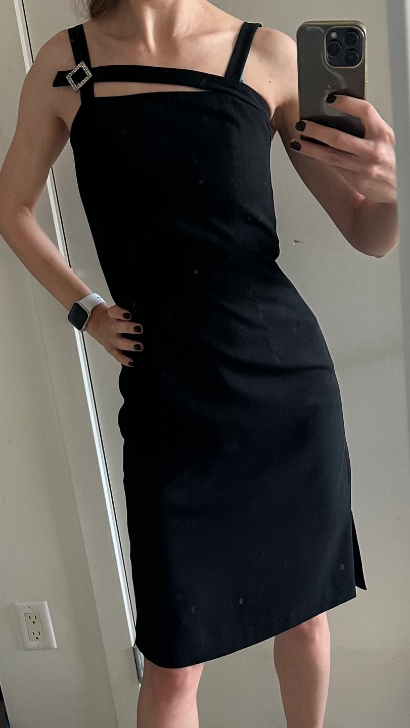 561Form-fitting black dress. Features a unique cutout and rhinestone accent. Suitable for various occasions. Simple, elegant style. S size