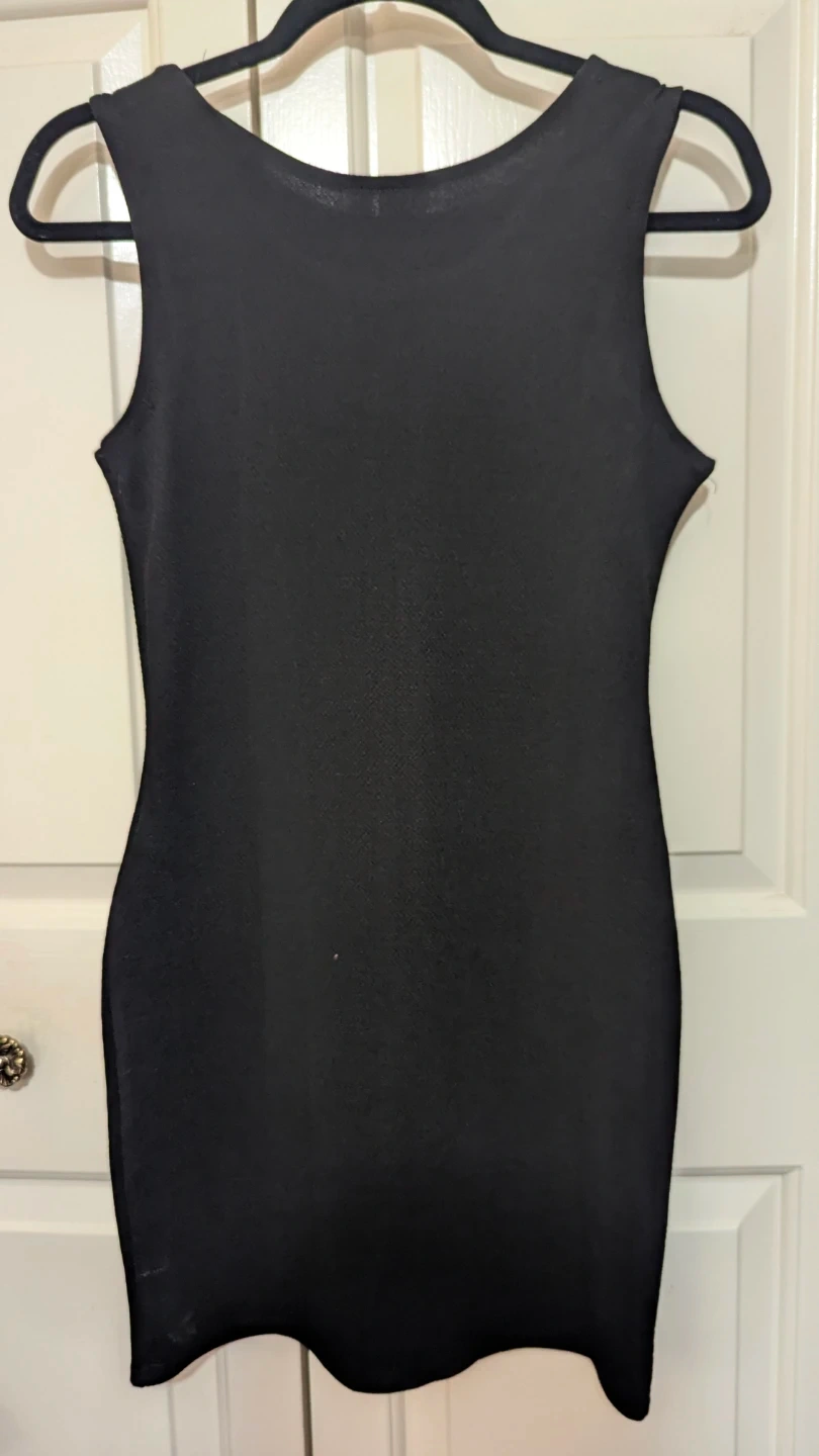 86Selling a cute black sleeveless dress. It has a colourful beaded design on the front. Perfect for a night out or a special occasion! Has one or two of the studs missing. Downsizing for move.