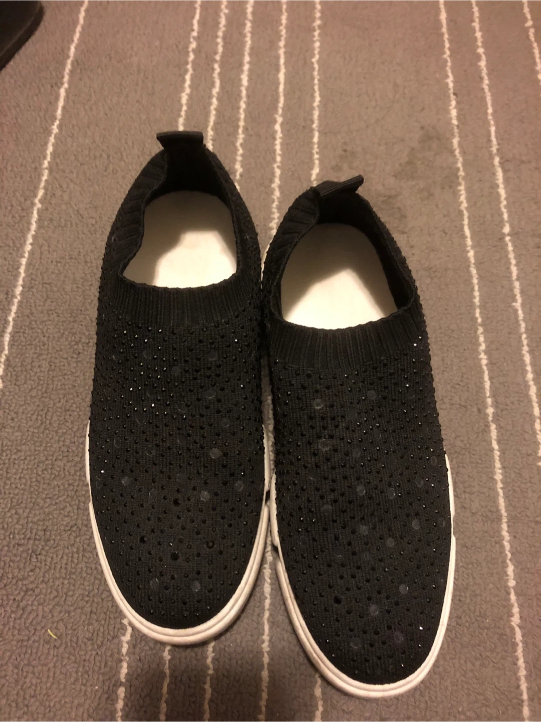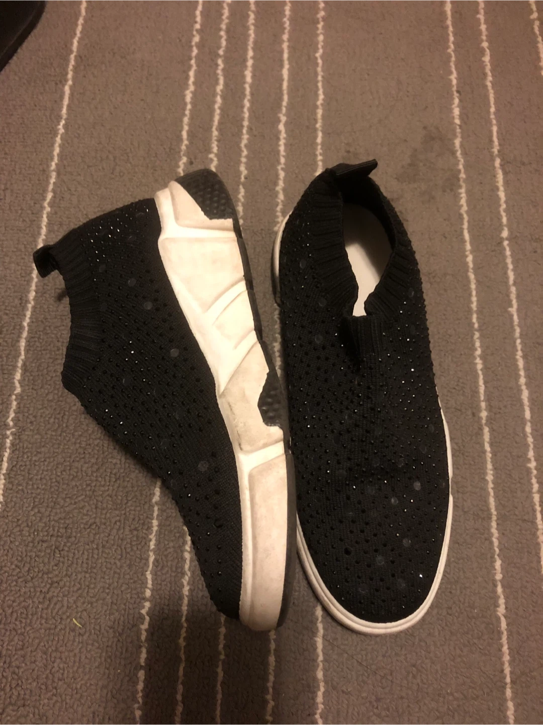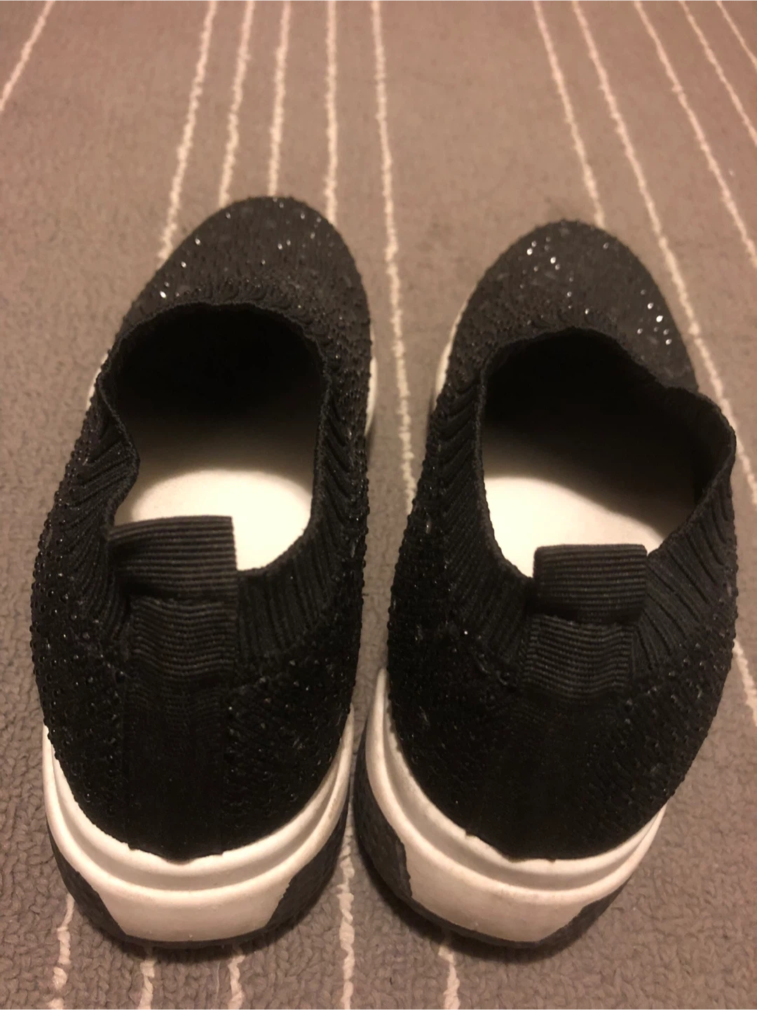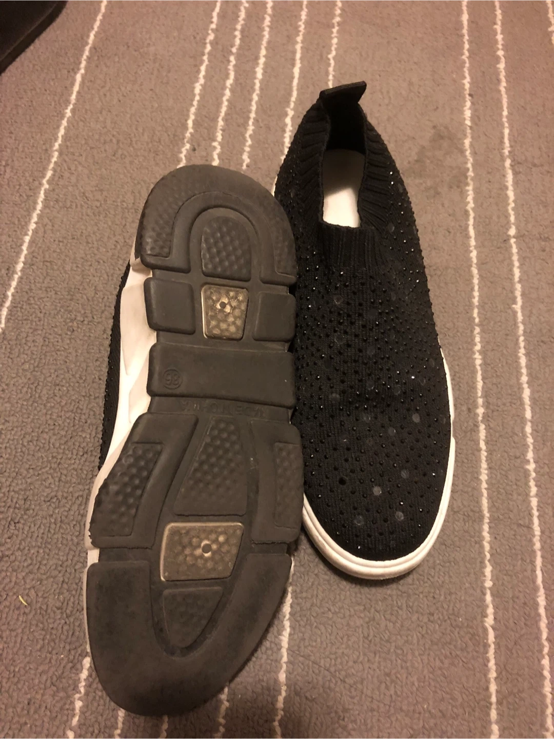 Selling a pair of black slip-on sneakers. They're size 36 and have a sparkly design on the upper part of the shoe. They show some signs of wear on the soles, but are still in good condition for everyday use