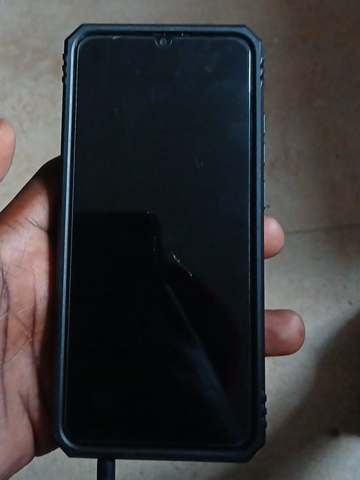 Selling a smartphone in a rugged black case. It's in good condition and ready for a new owner. Perfect for someone who needs a durable phone!