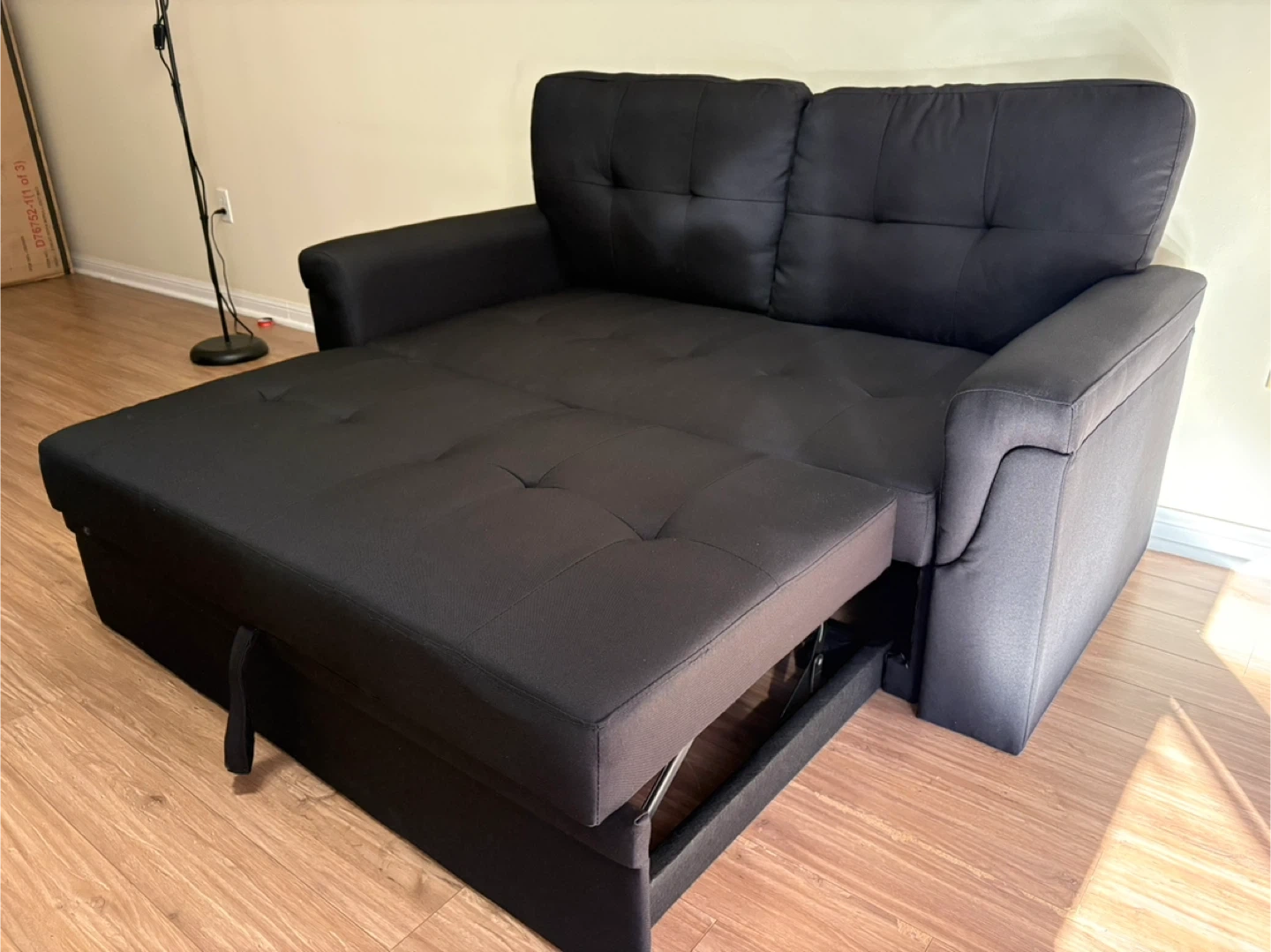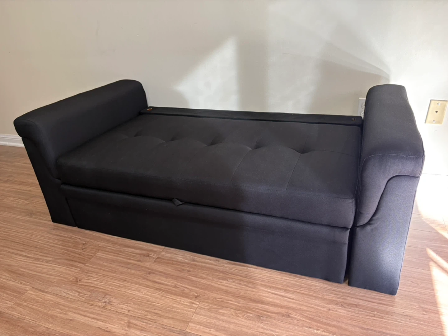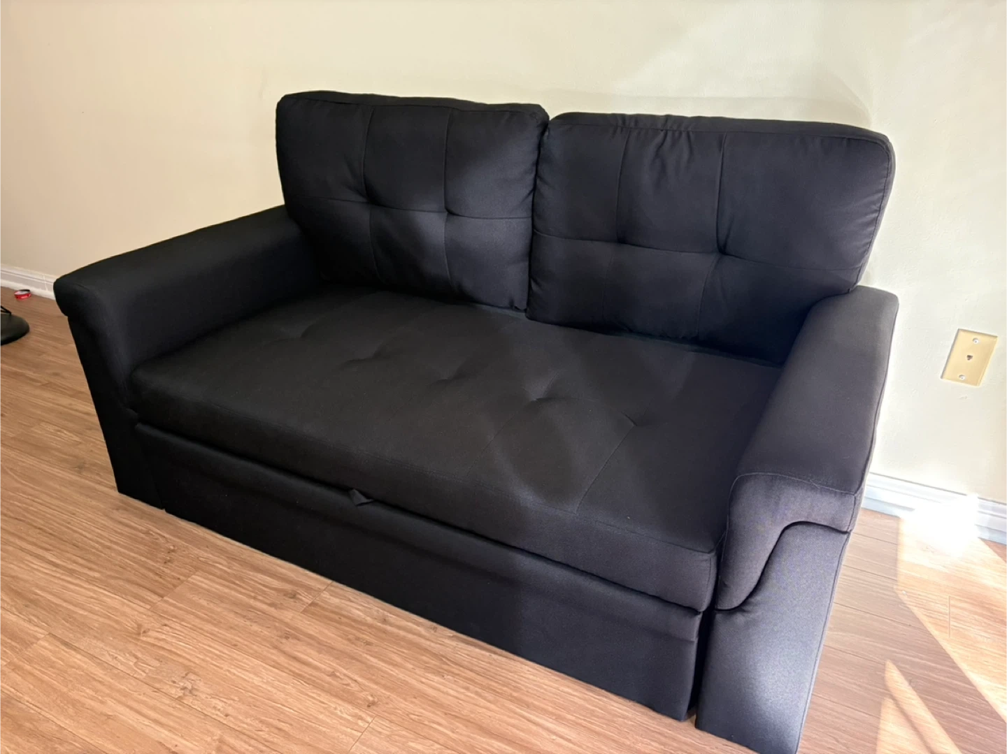 60Selling a black sofa in excellent condition. I bought it just a week ago, but unfortunately, the delivery was incomplete, and the backrest is missing. The sofa is foldable/convertible, making it perfect for small spaces. Despite the missing backrest, the sofa is very comfortable and stylish. A great opportunity to get a high-quality piece of furniture at a discounted price! Measurements W 60" × H 33" (with cushions) × D 30" (folded) / 54" (unfolded)
