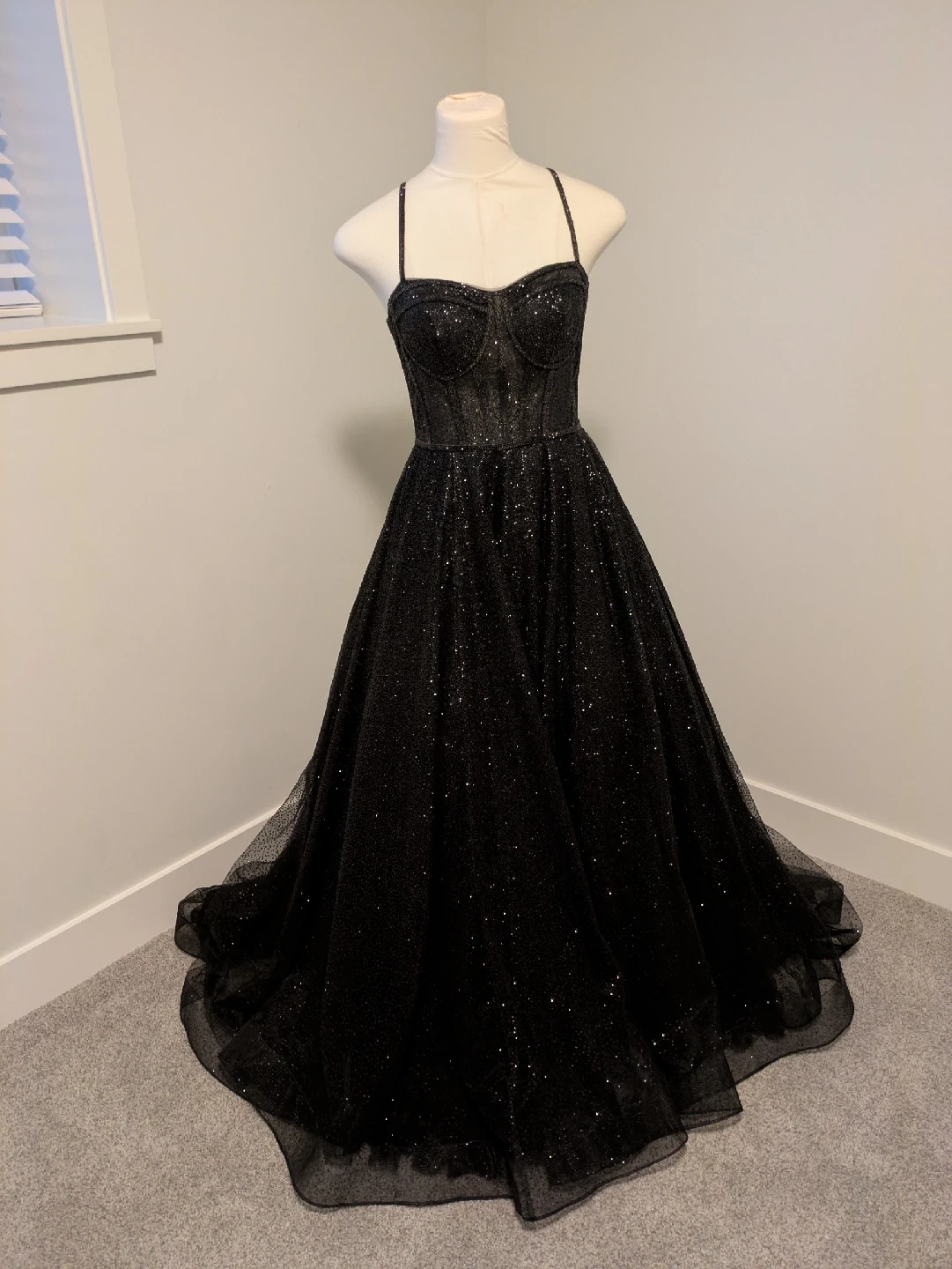 0Selling a beautiful black sparkly corset ball gown. Perfect for prom or a special event. It has a corset top and a full, flowing skirt. The dress is in good condition and ready to wear! It comes with it's protective dress bag.