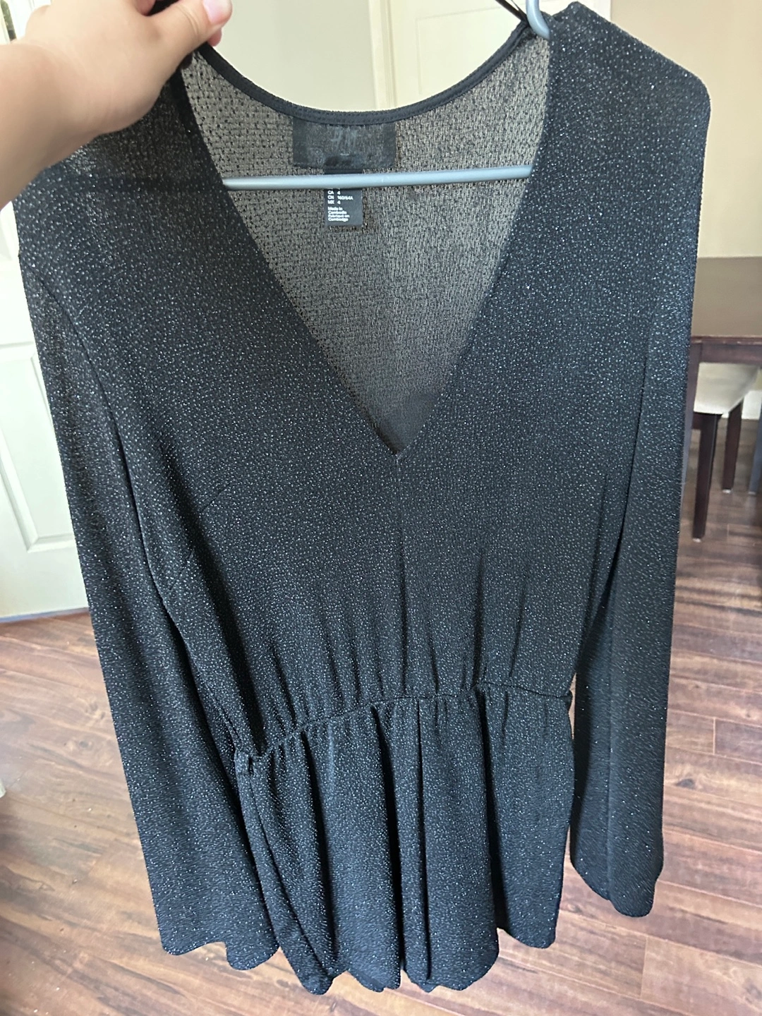 Long-sleeved Romper. V-neck design. Gathered waist. Perfect for a quiet evening out.