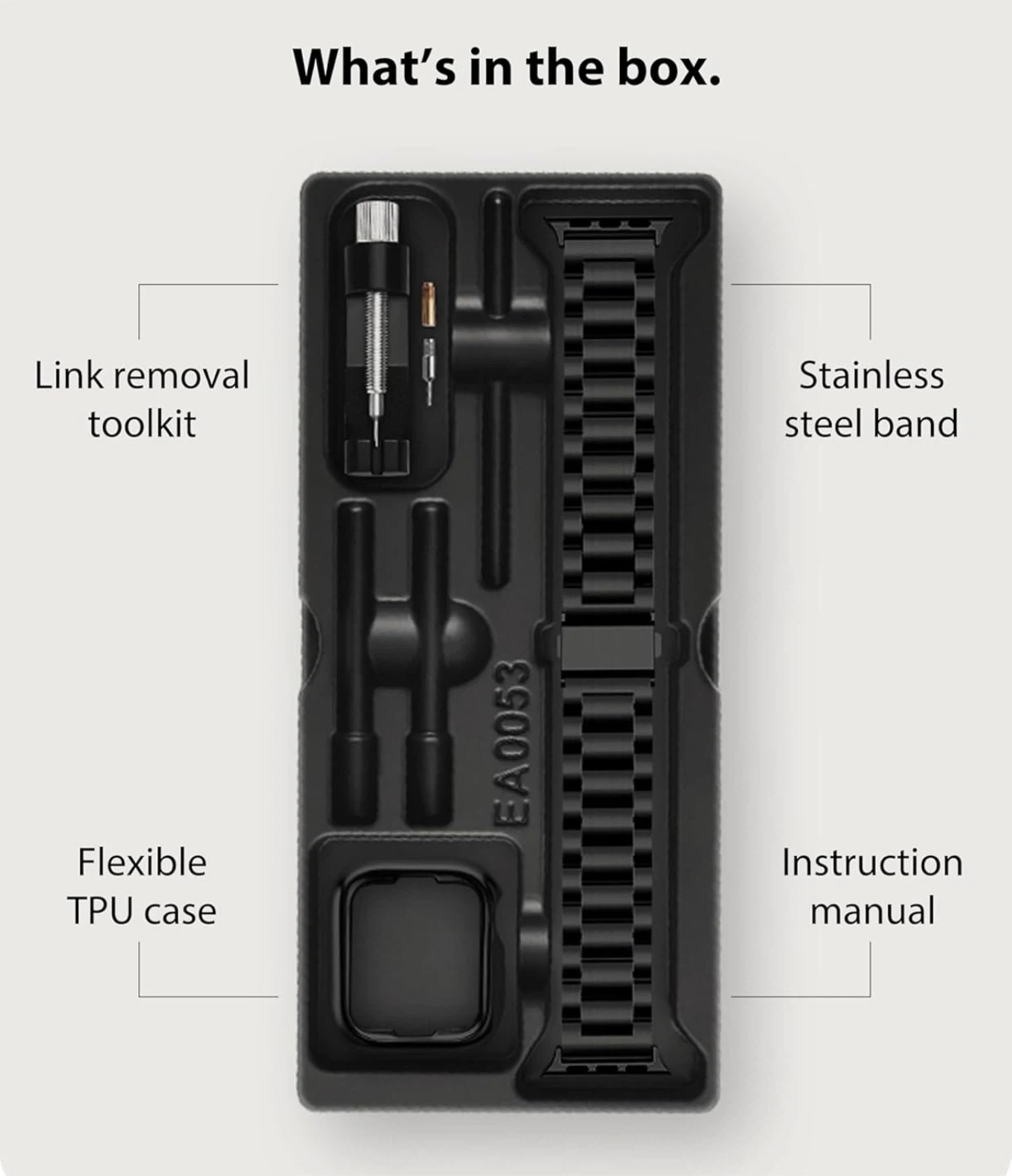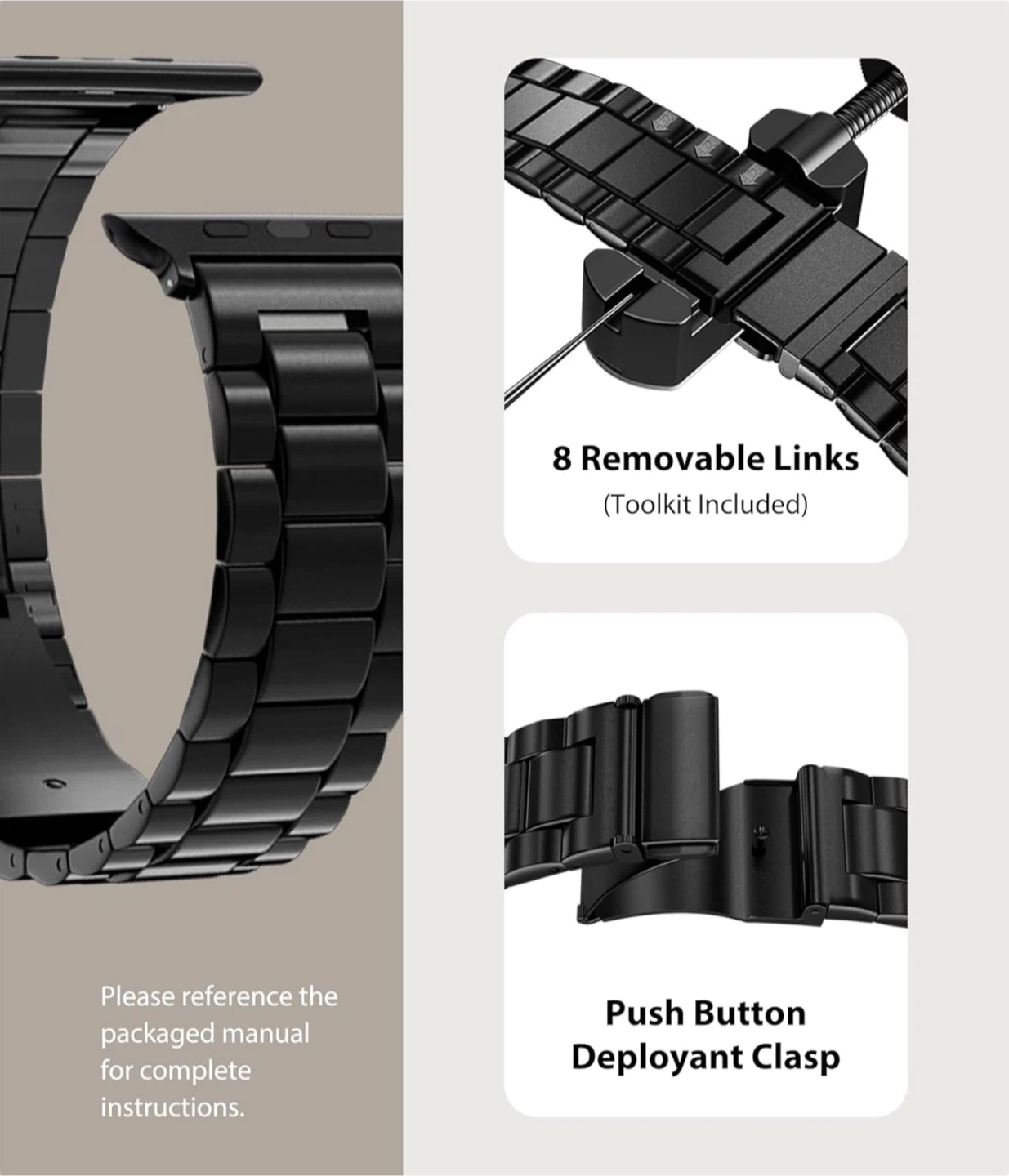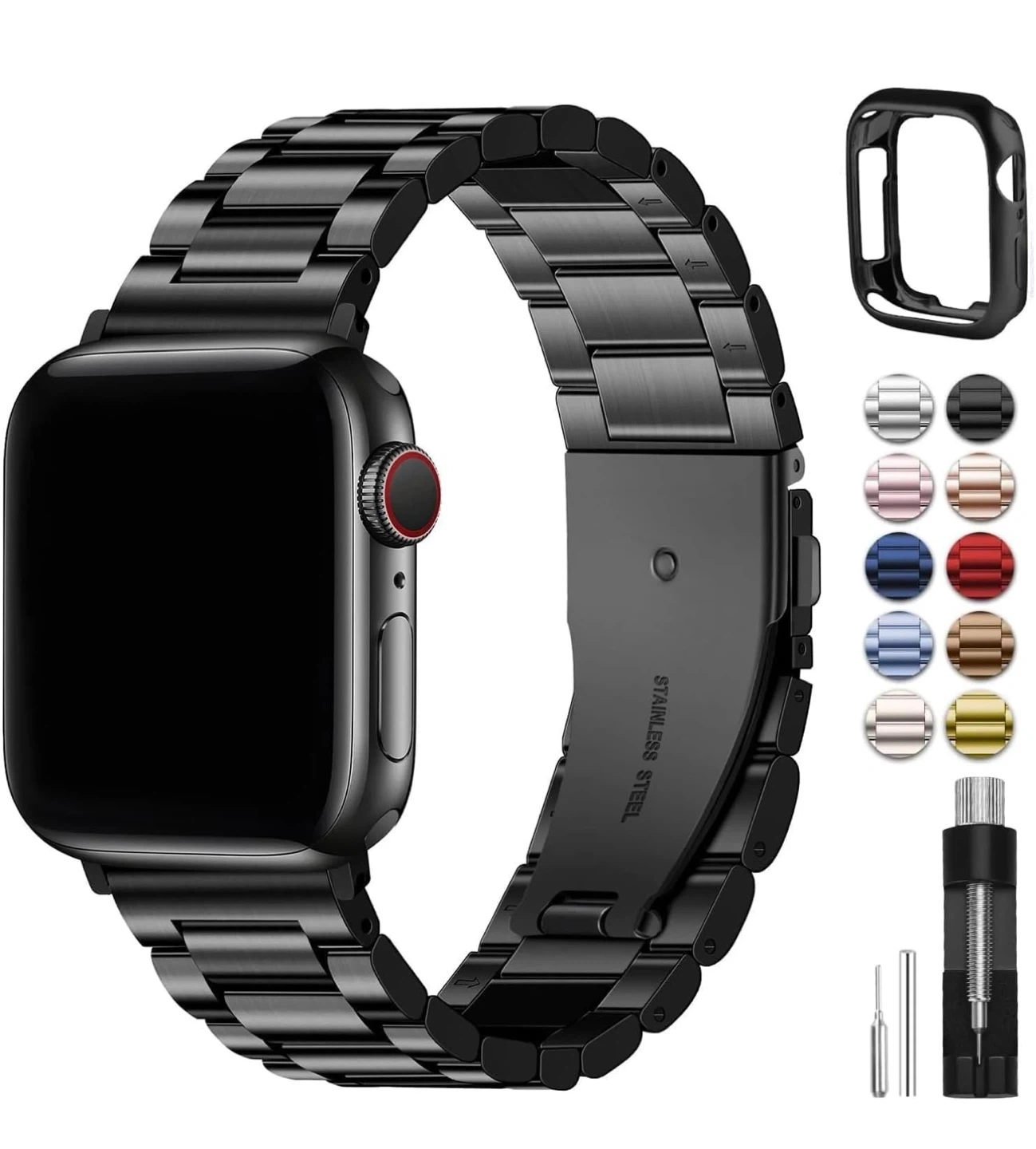 Looking to switch up your Apple Watch band? This black stainless steel band comes with a flexible TPU case and a link removal toolkit. The band features a push button deployant clasp and includes 8 removable links to adjust the size.