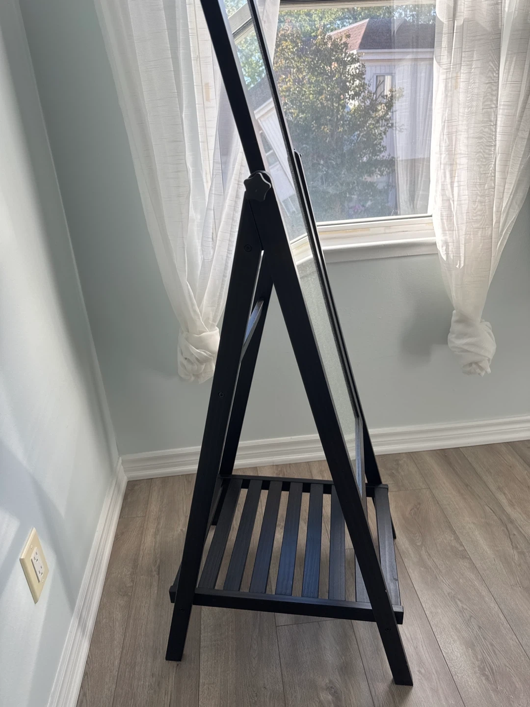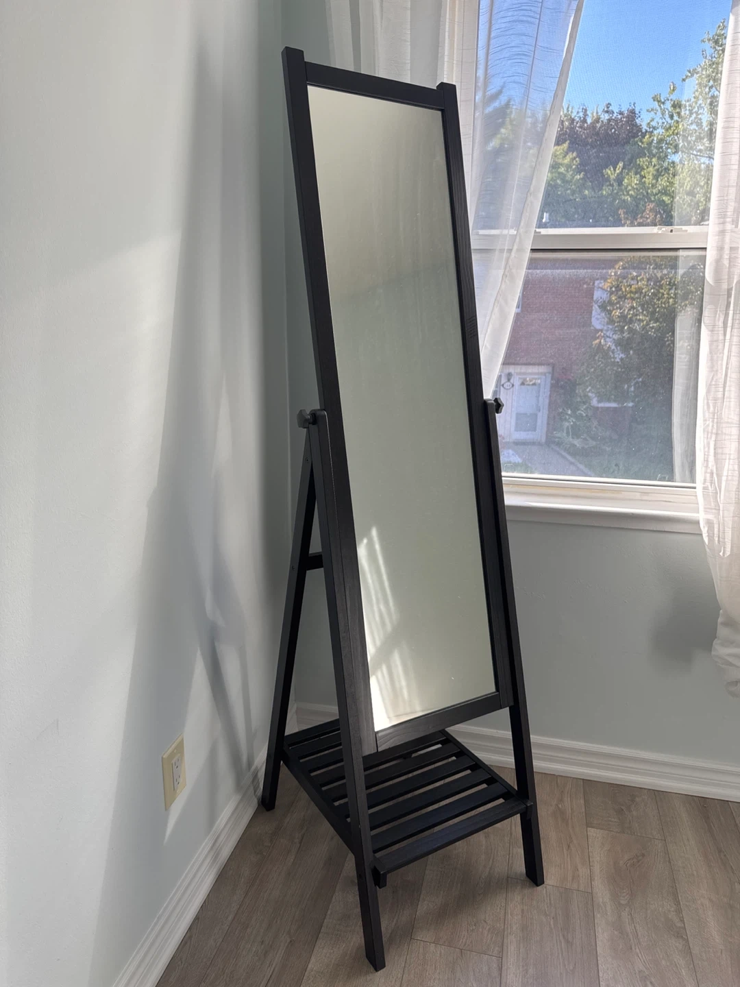 456Selling a standing mirror in great condition! It's a sleek black colour and would look great in any bedroom or living space. The mirror has a stand and a shelf at the bottom for storage. It's perfect for getting ready in the morning or adding a touch of style to your home