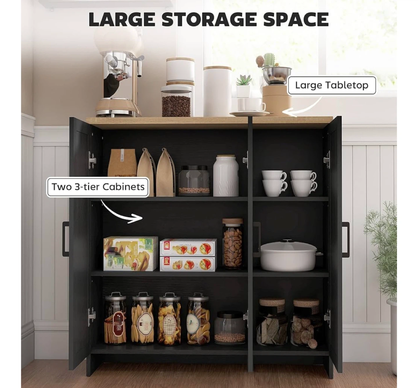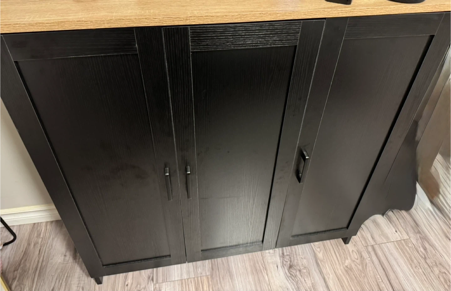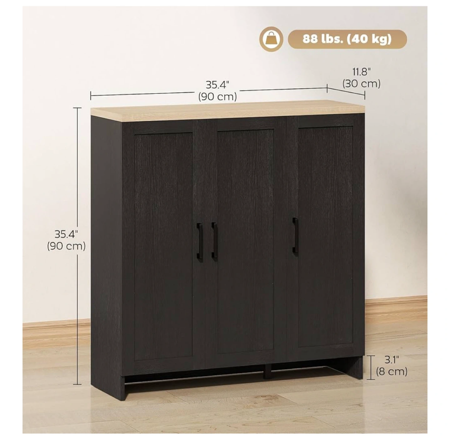Looking to add some storage to your home? This black storage cabinet features three doors and a large tabletop, perfect for organizing any space. It has two 3-tier cabinets inside. The cabinet measures approximately 35.4" (90 cm) in width and height, and 11.8" (30 cm) in depth