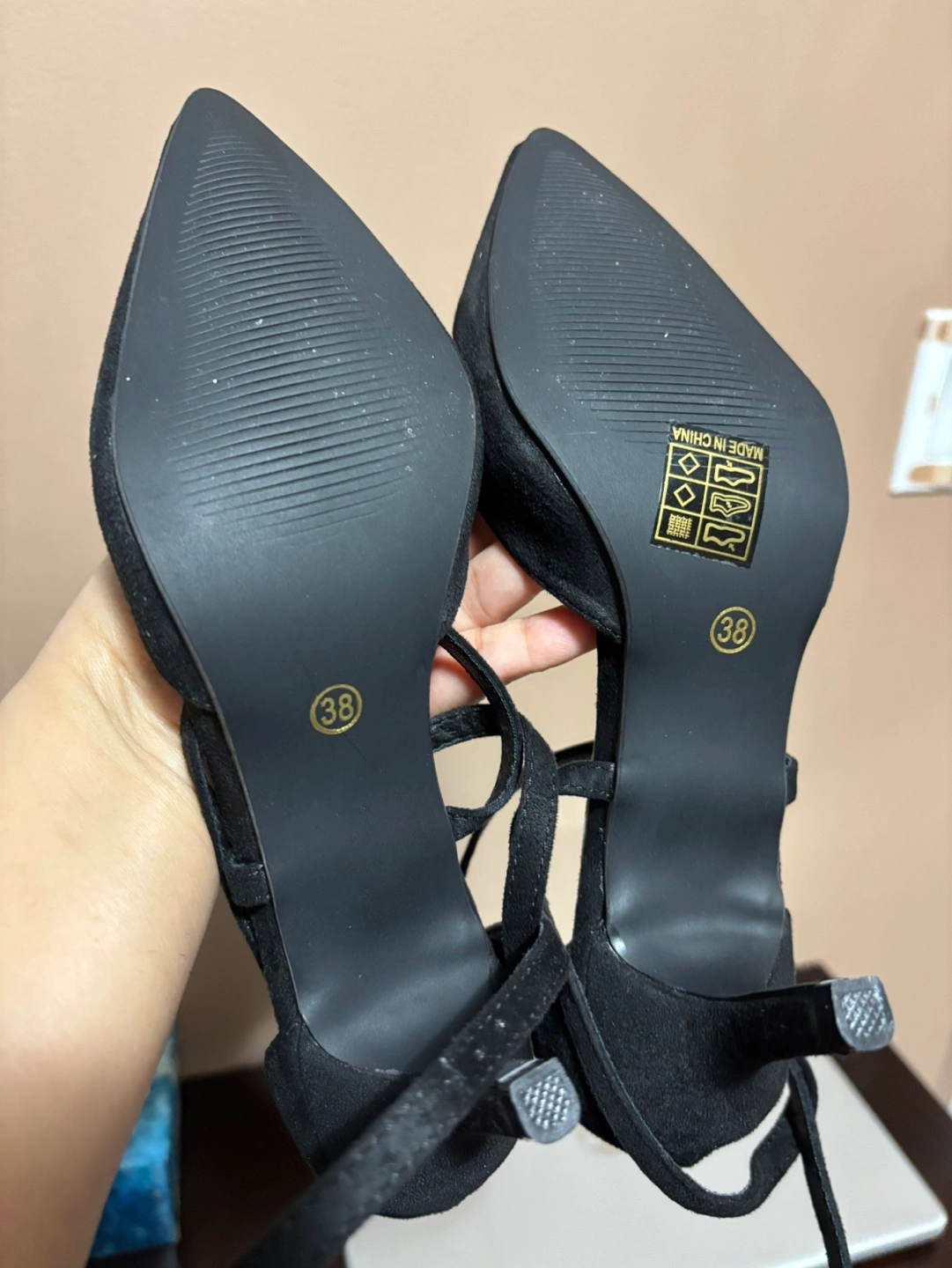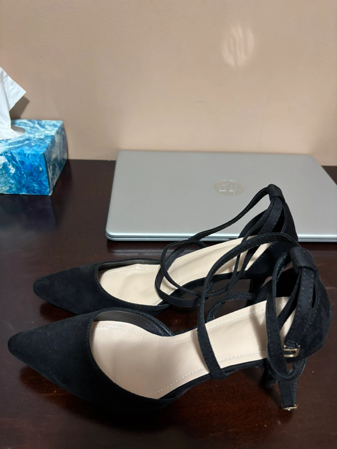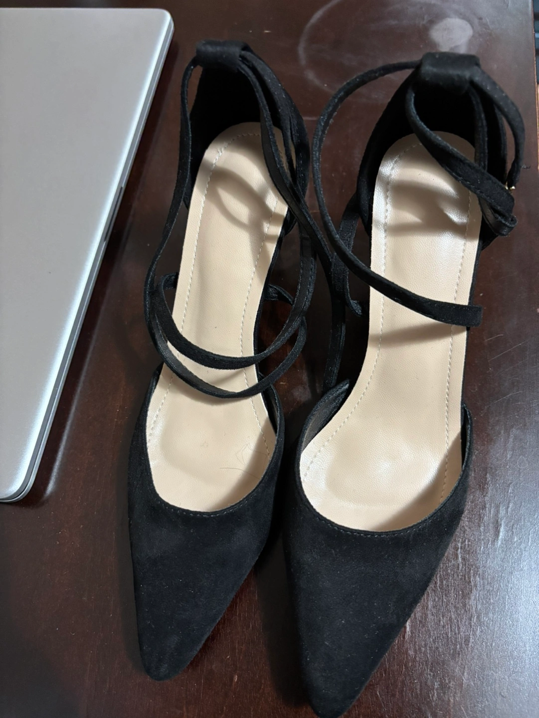 39Elegant black suede heels. Pointed toe. Ankle tie closure. Size 38. Made in China.