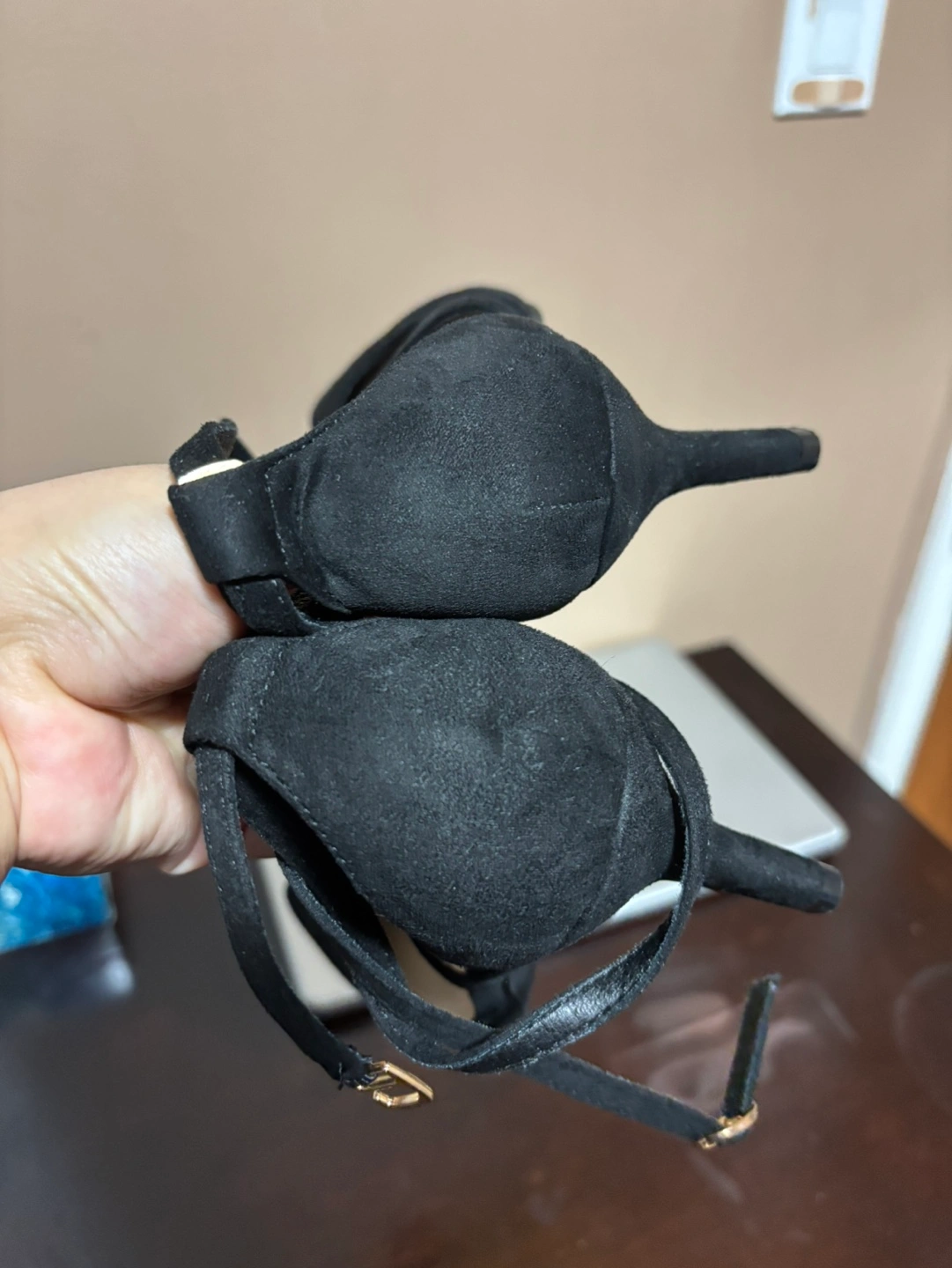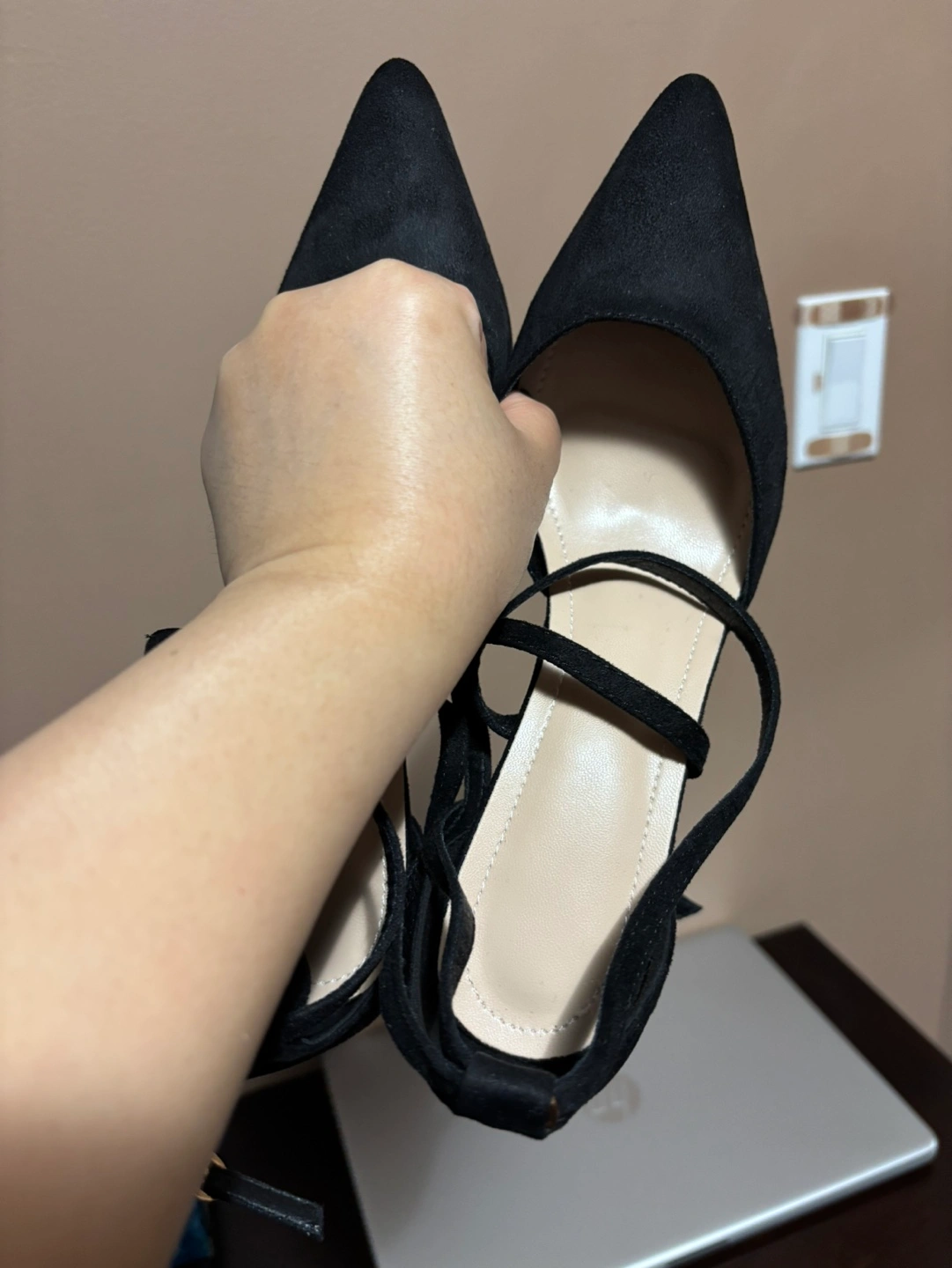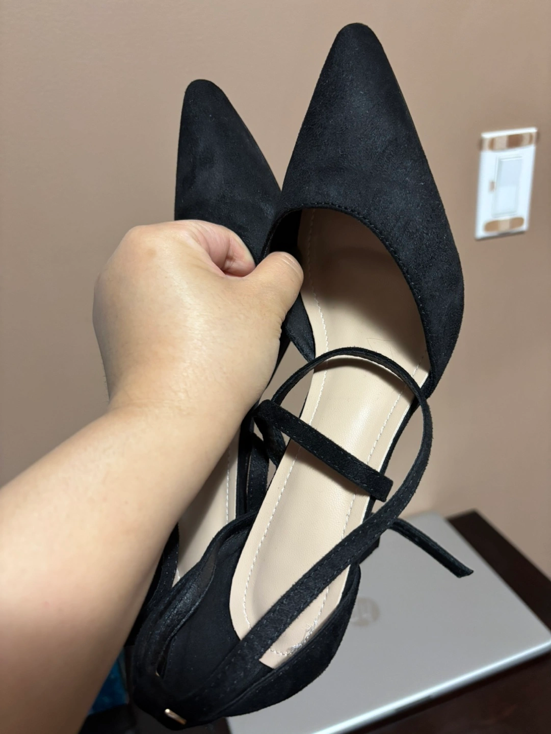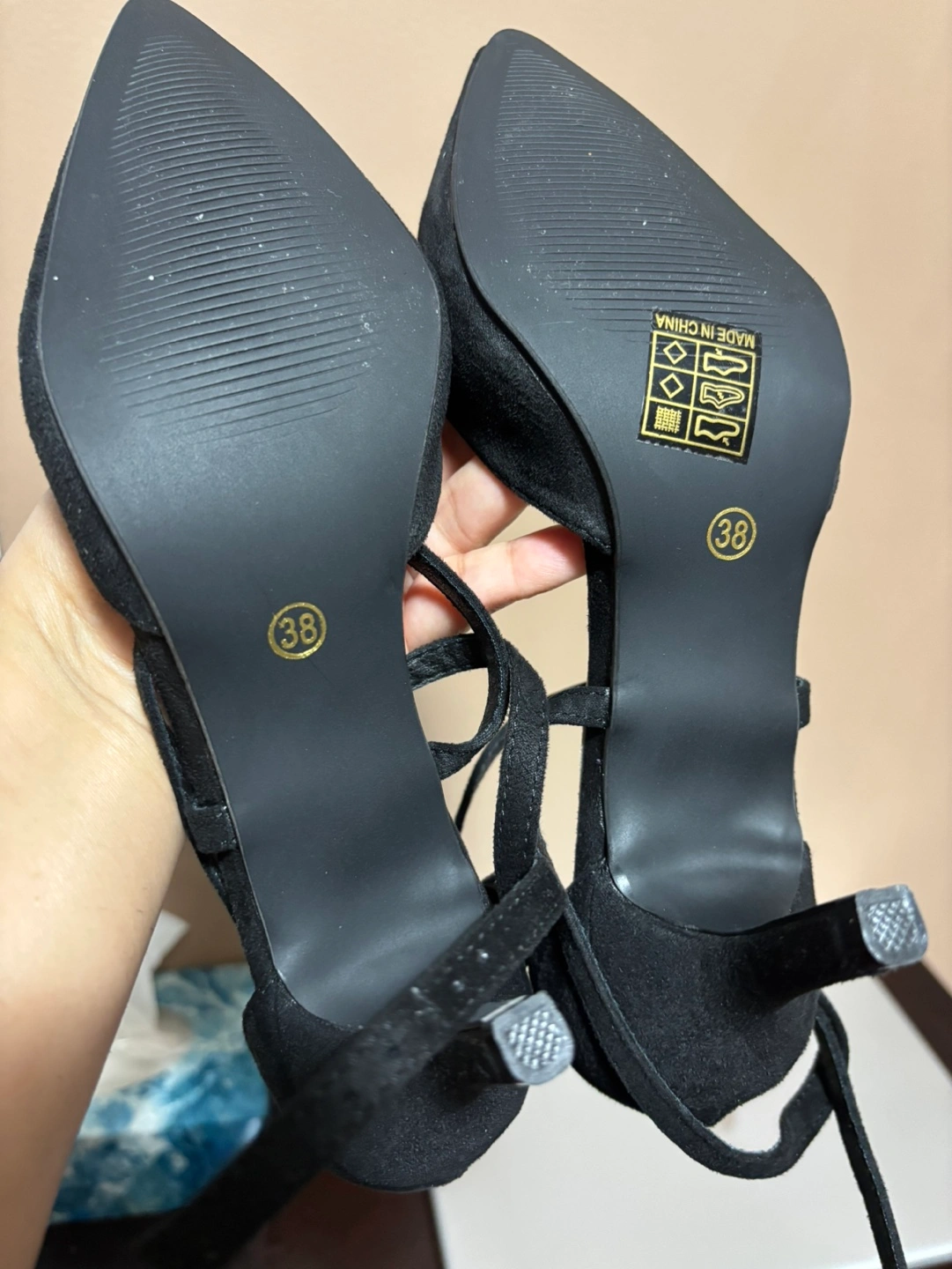 39Elegant black suede heels. Pointed toe. Ankle tie closure. Size 38. Made in China.