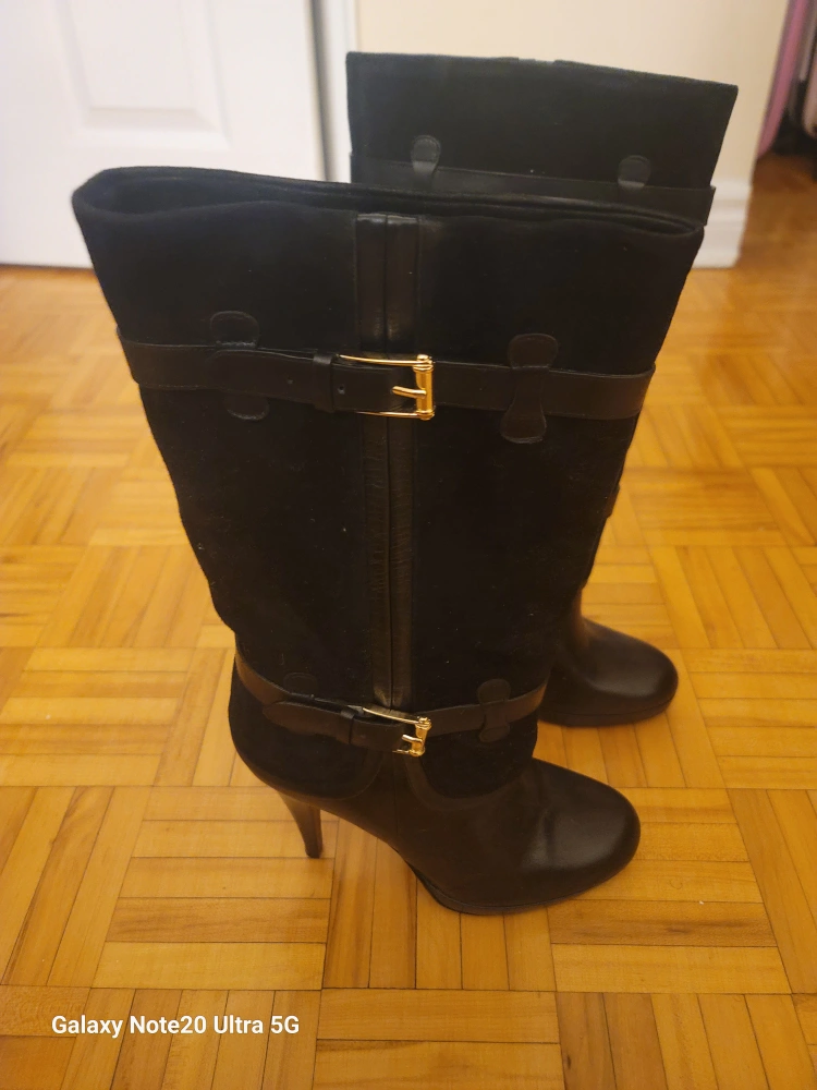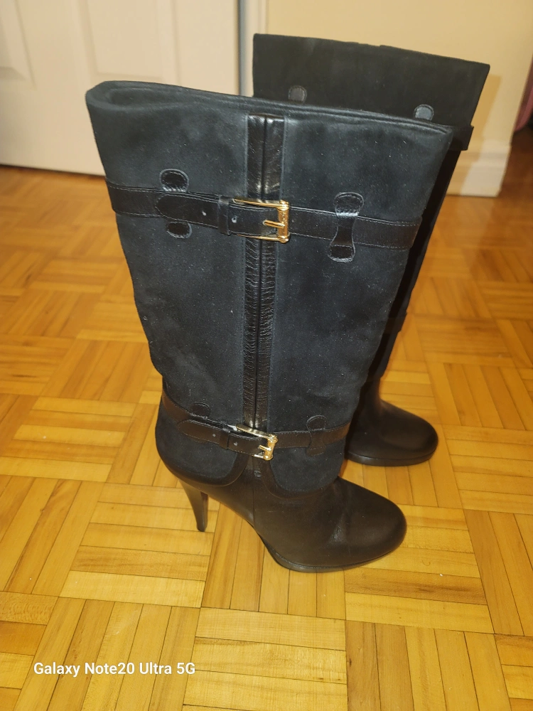 Stylish black suede boots. They feature a sleek design with buckle detailing and a comfortable heel height. Perfect for adding a touch of elegance to any outfit!