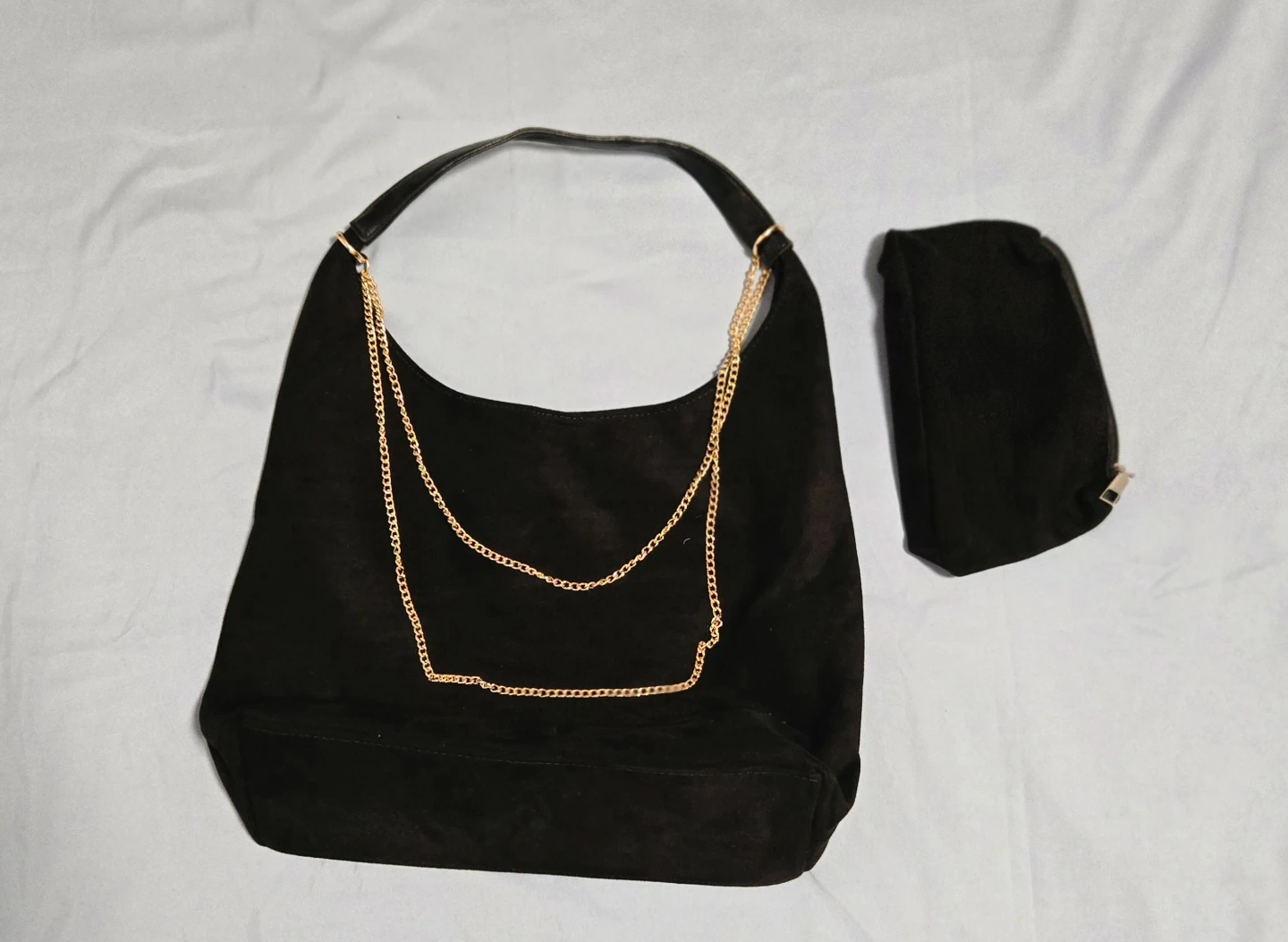 10Selling a stylish black suede hobo bag. It comes with a matching pouch and a gold chain detail, adding a touch of elegance to the overall look