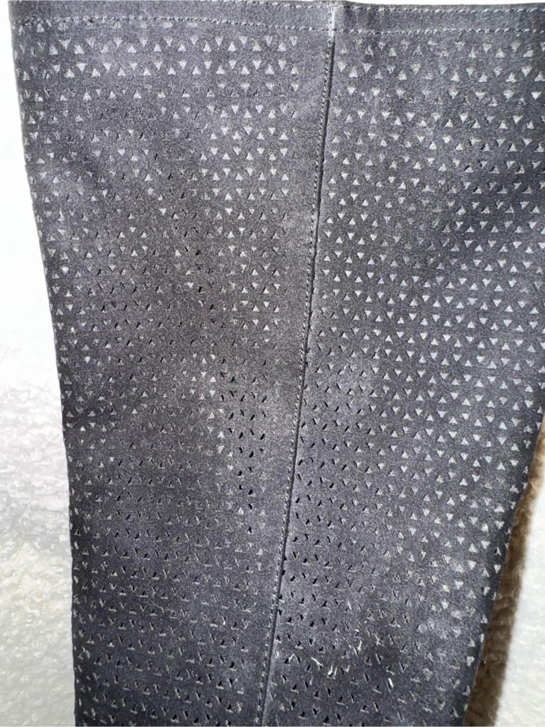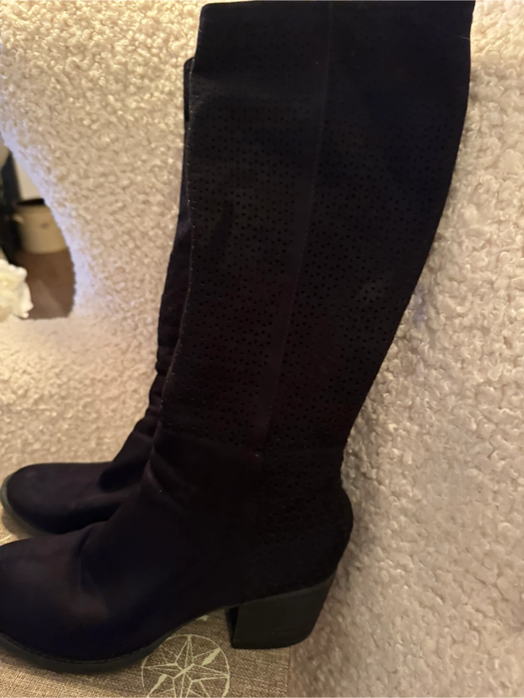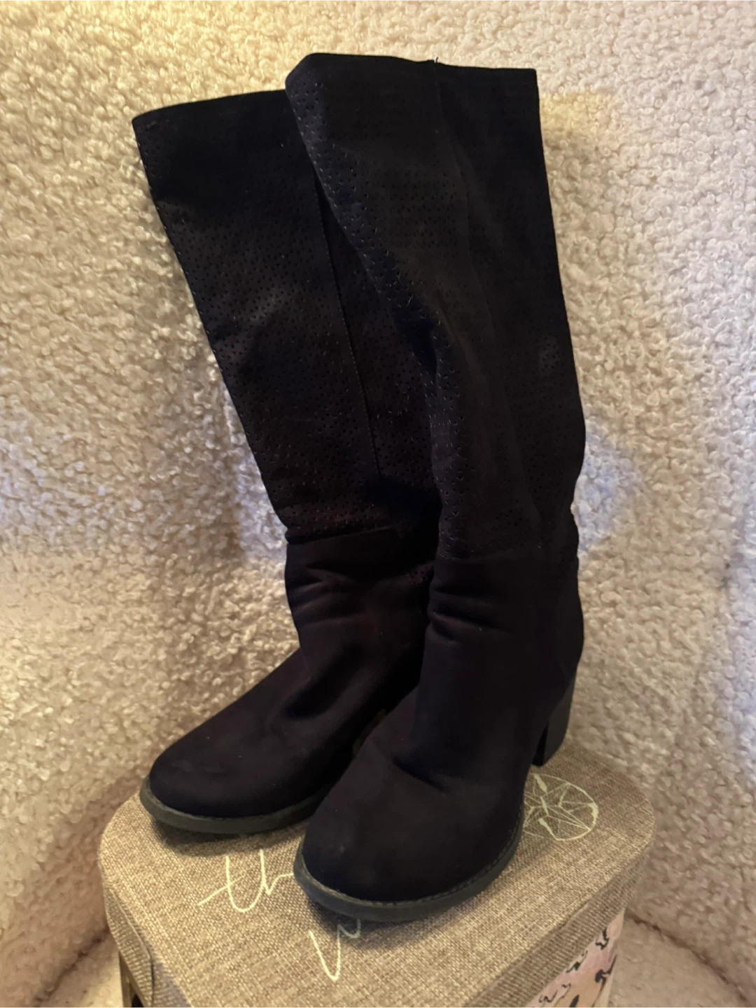 94Elevate your style with these gently used size 6 black suede, knee-high boots, perfect for adding a touch of chic to any outfit. The s boots feature a stylish, laser cut design with a stacked heel and back zipper goes perfectly with any outfit Specifications: * Size: 6 * Colour: Black * Style: Knee-High Boots * Material: Suede * Heel Height: Medium (2-3) inches These boots are are good quality and still have lots of life left in them. If the ad's still up, the boots are still available!