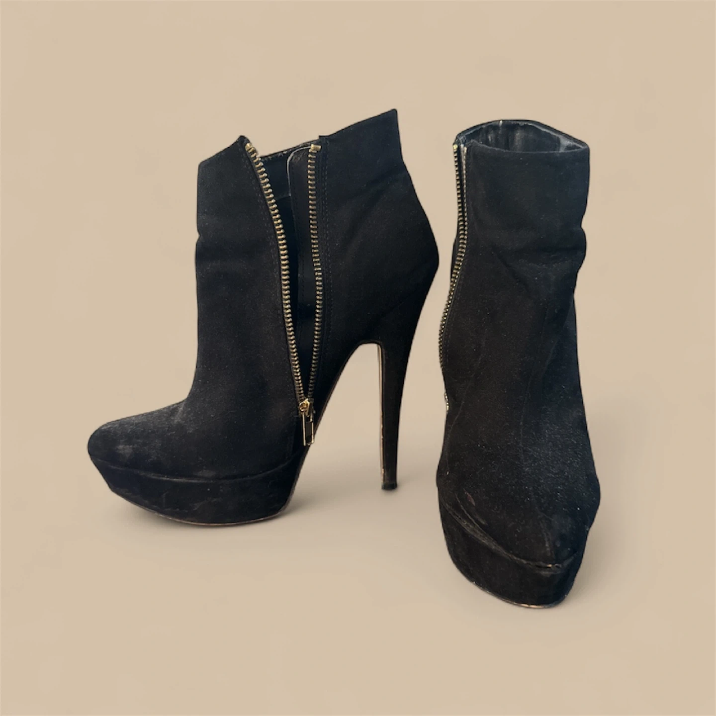 Selling a pair of black suede ankle booties. They feature a zippered closure and a high heel. They show some signs of wear. Very high arch.
