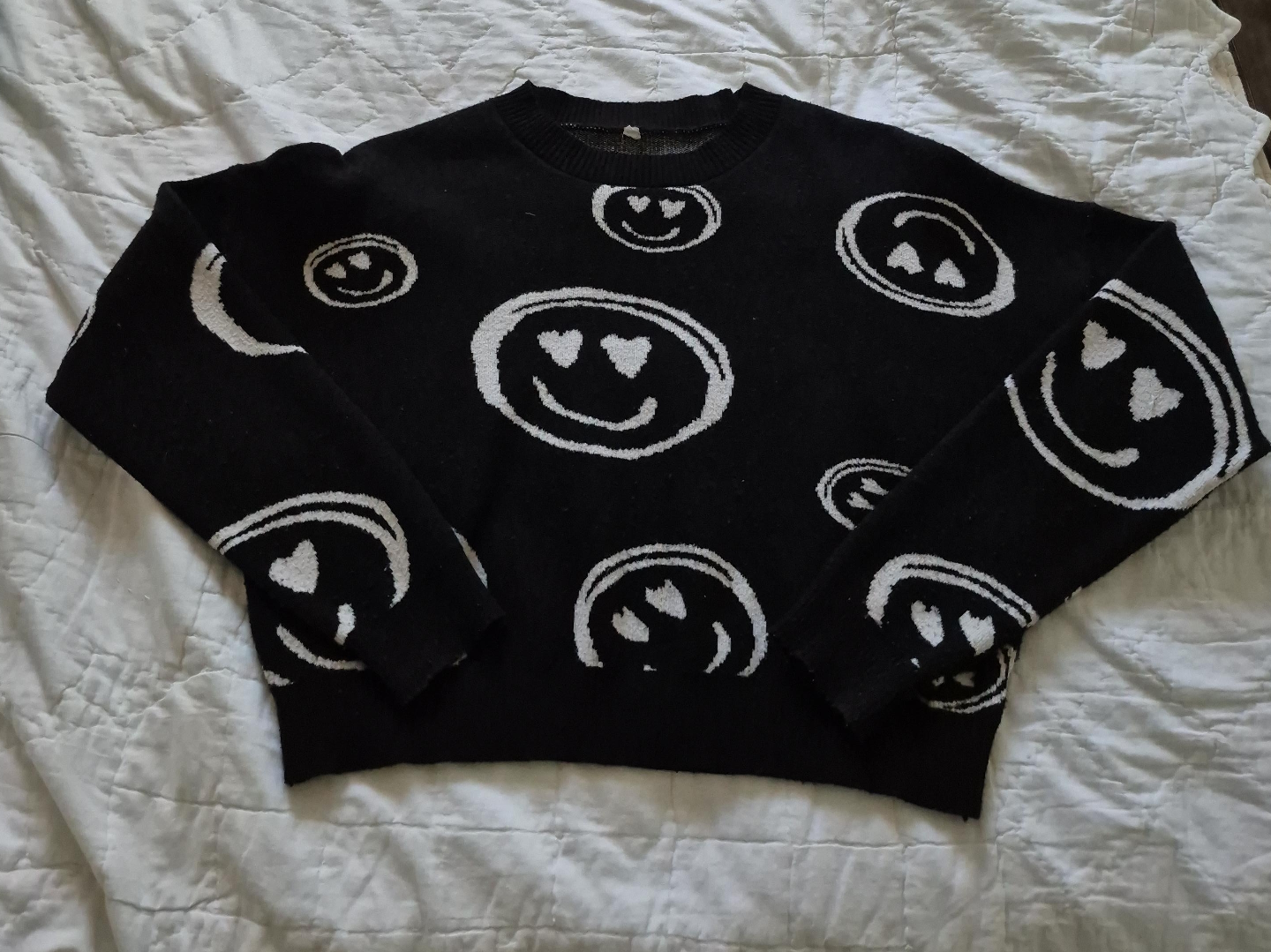25Cozy black sweater with a cute smiley face pattern! It's in great condition and perfect for adding a bit of fun to your wardrobe