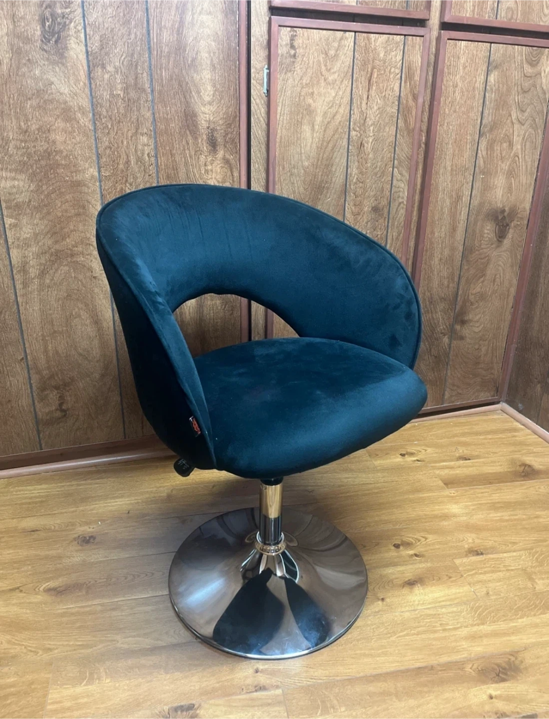 76Selling a stylish black swivel chair! It's in great shape and is perfect for a vanity. The chair has a weight capacity of 285lbs. It's adjustable from 16 1/4" to 21" in height. The seat is 22" wide and 17 1/4" deep. The back is 13 3/4" high. The base is 13 3/4" in diameter