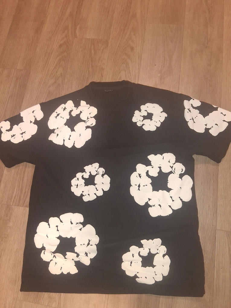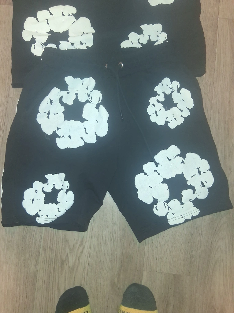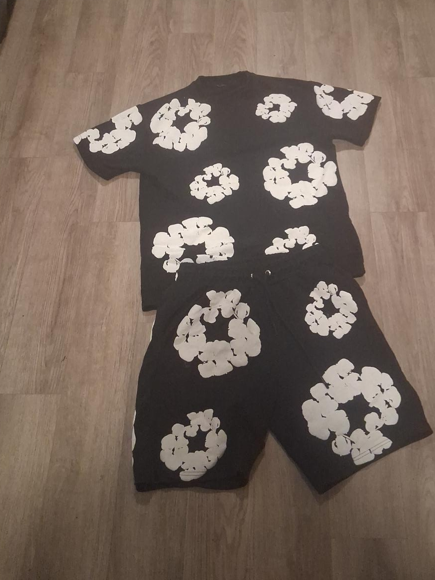 Selling a matching t-shirt and shorts set in black with a white floral print. The shorts have a drawstring waist for a comfortable fit. Great for casual wear!