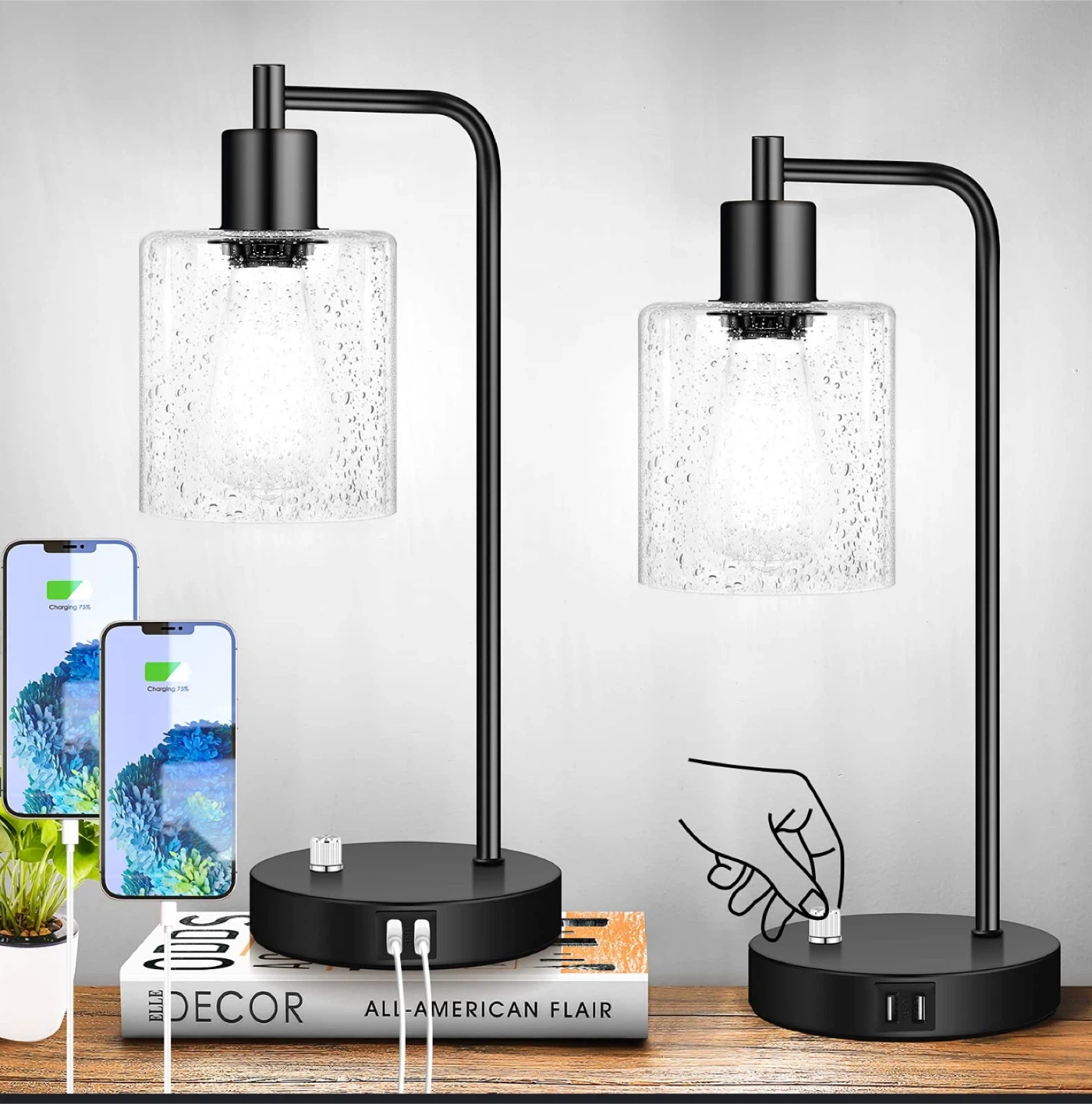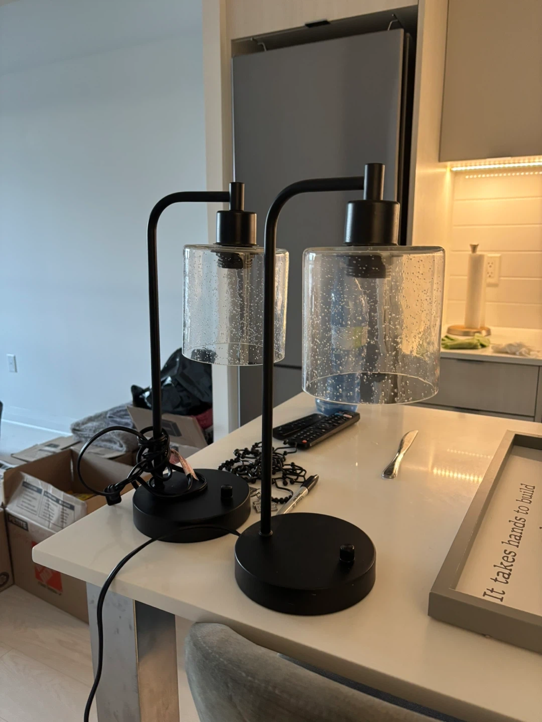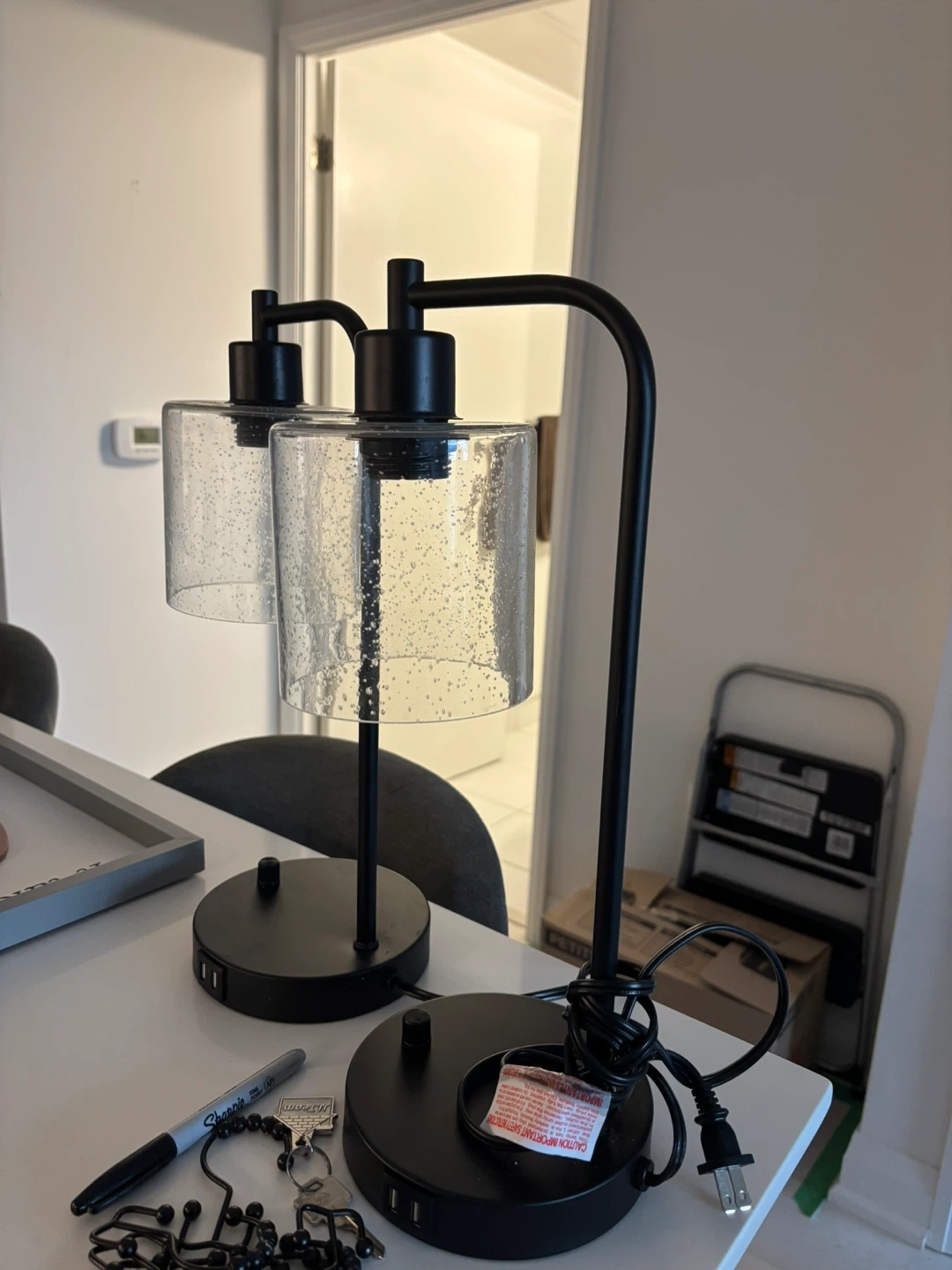 60Selling a pair of stylish black table lamps! These lamps feature a sleek design with convenient USB charging ports built into the base. They're perfect for bedside tables or desks, adding both light and functionality to your space. The lamps have a modern look with seeded glass shades.