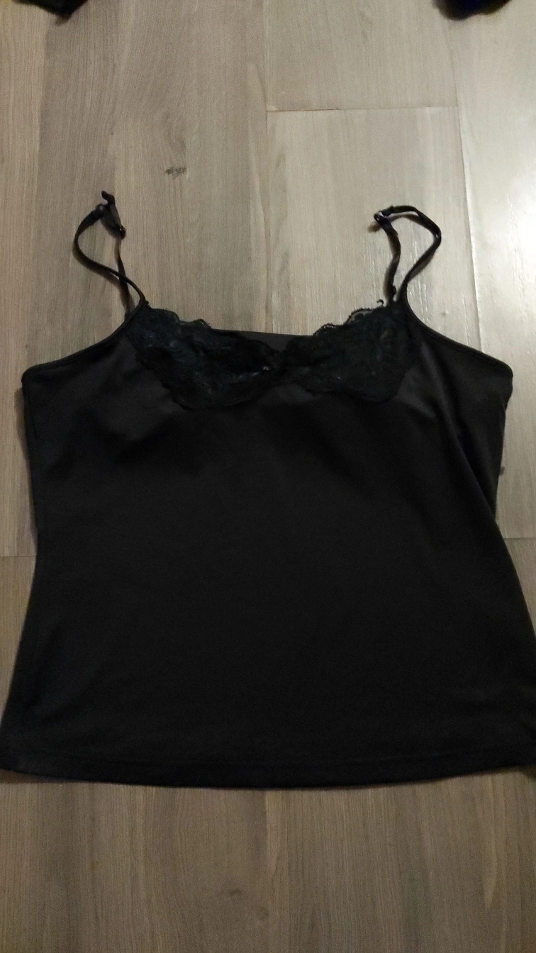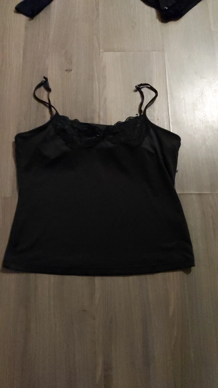 Selling a black tank top with lace details. It's in great condition and ready for a new home! Perfect for layering or wearing on its own, this camisole is a versatile addition to any wardrobe