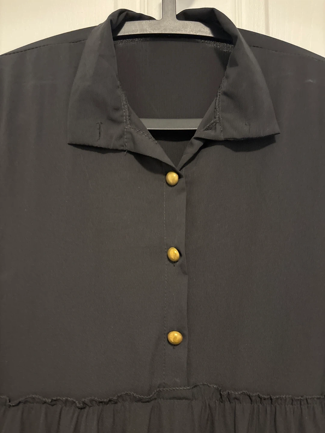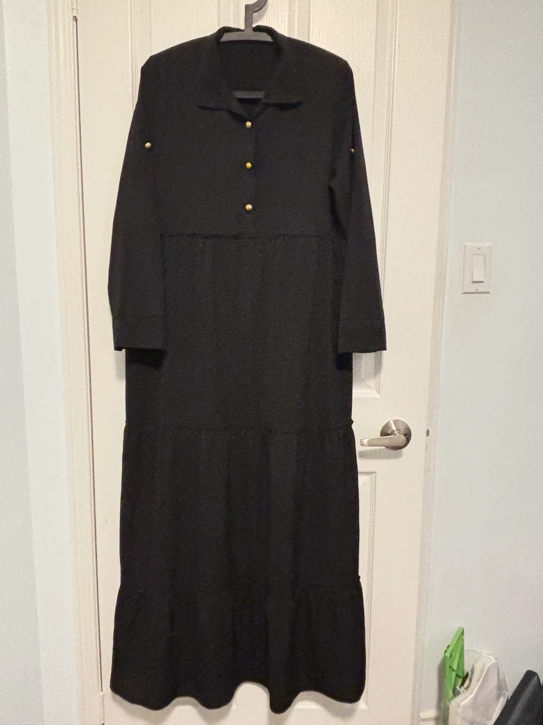 This is a lovely black maxi dress. It features long sleeves and gold button details. It's in great condition and ready for a new home