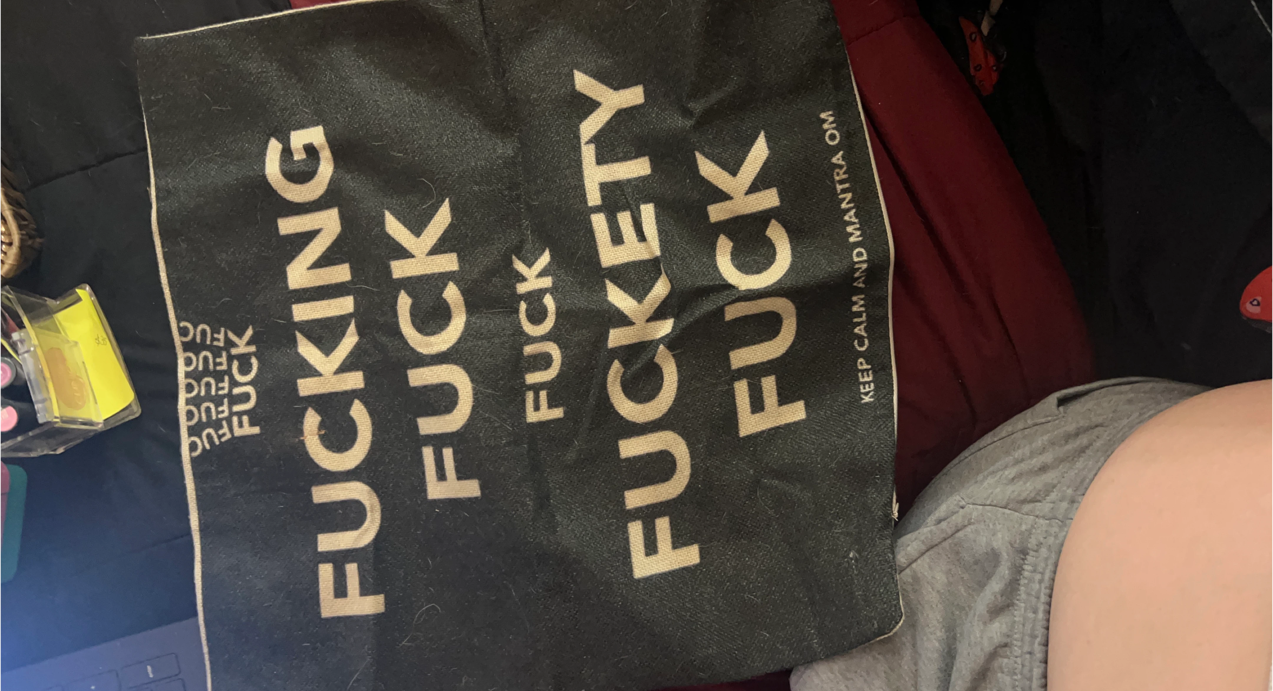 Black tote bag with the words 'Fucking Fuck Fuckety Fuck' printed on it, along with 'Keep Calm and Mantra On’