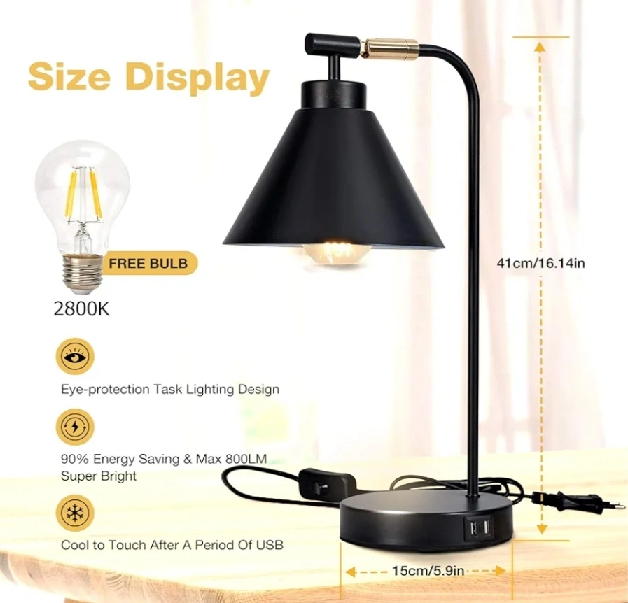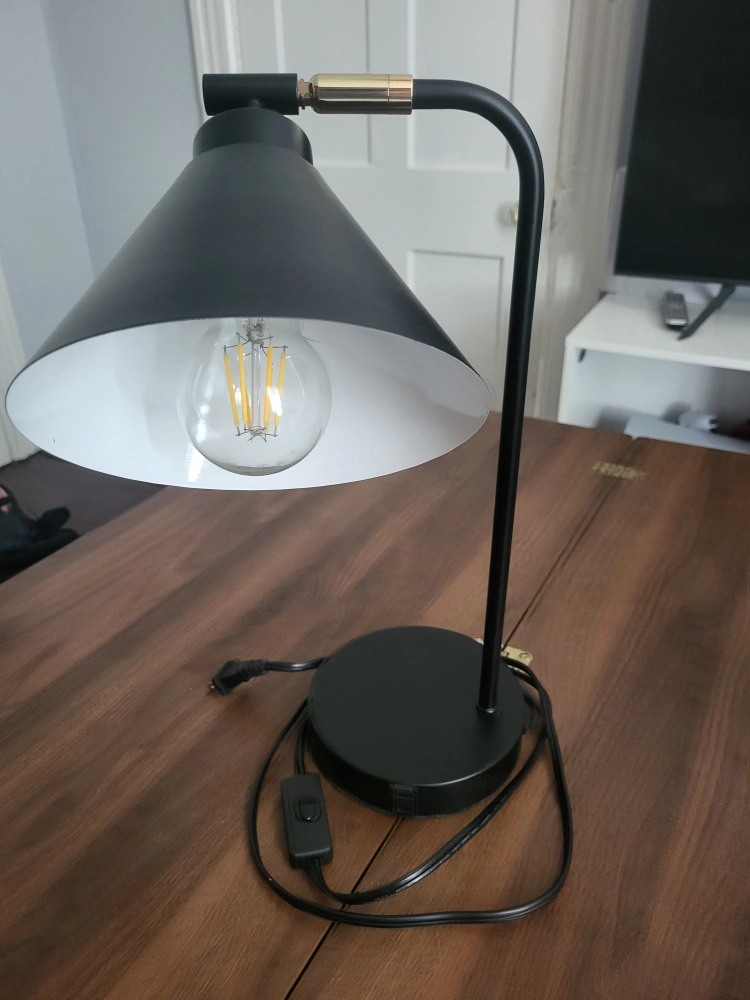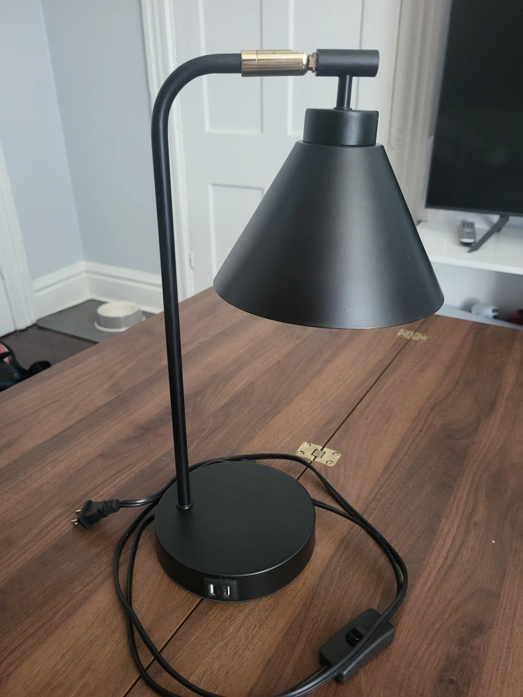 25This is a black table lamp with 3 brightness levels. It's touch sensitive and easy to use. It also has a USB port and a standard plug socket on the base for easy bedside charging/plugging in other devices. The lamp is 41cm/16.14in tall and the base is 15cm/5.9in in diameter. Pickup only.