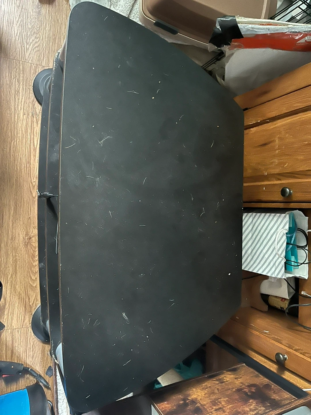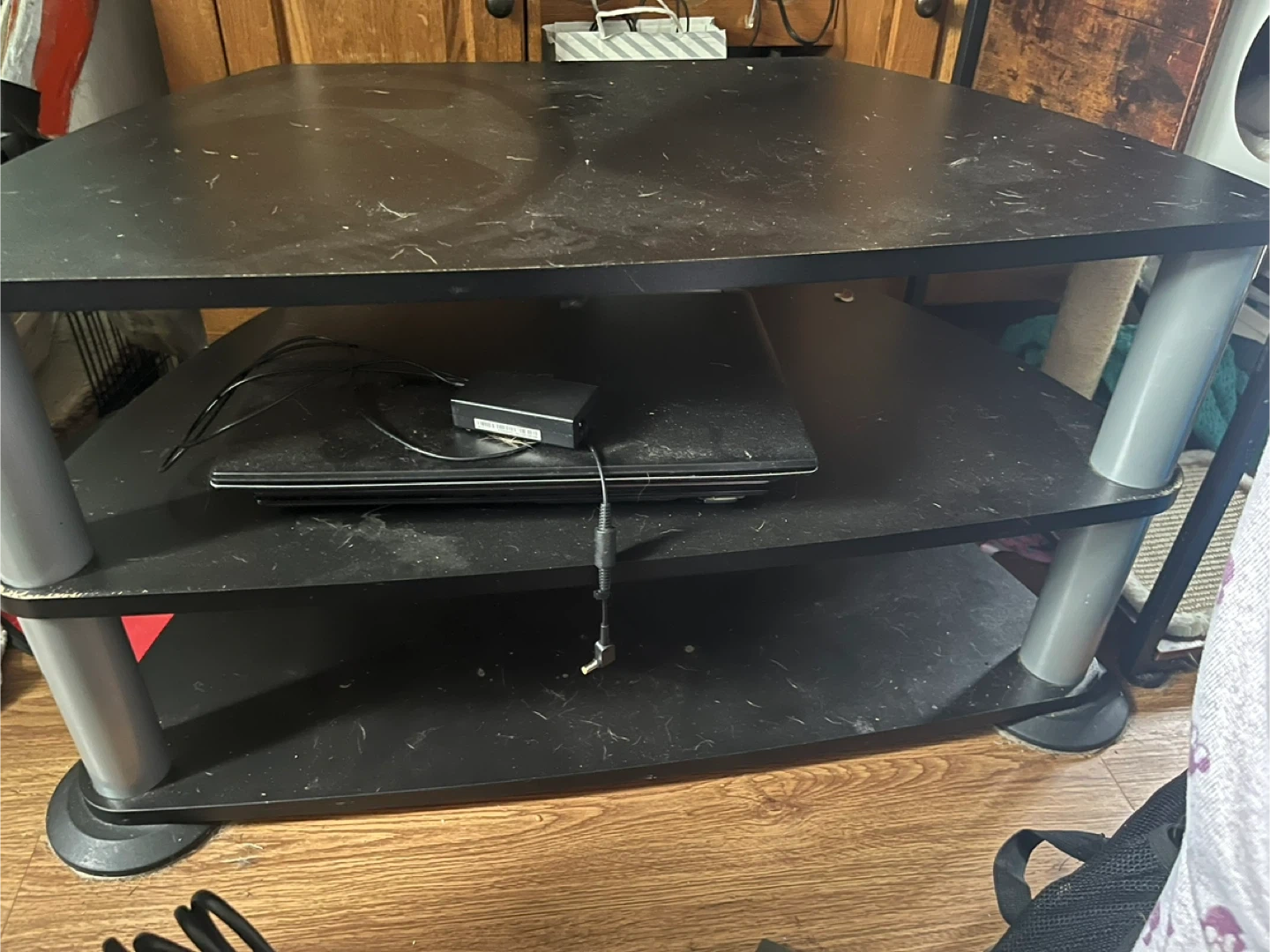 15Selling a black TV stand. It has three shelves for storage, perfect for a TV, gaming consoles, or other electronics. It is in good condition.