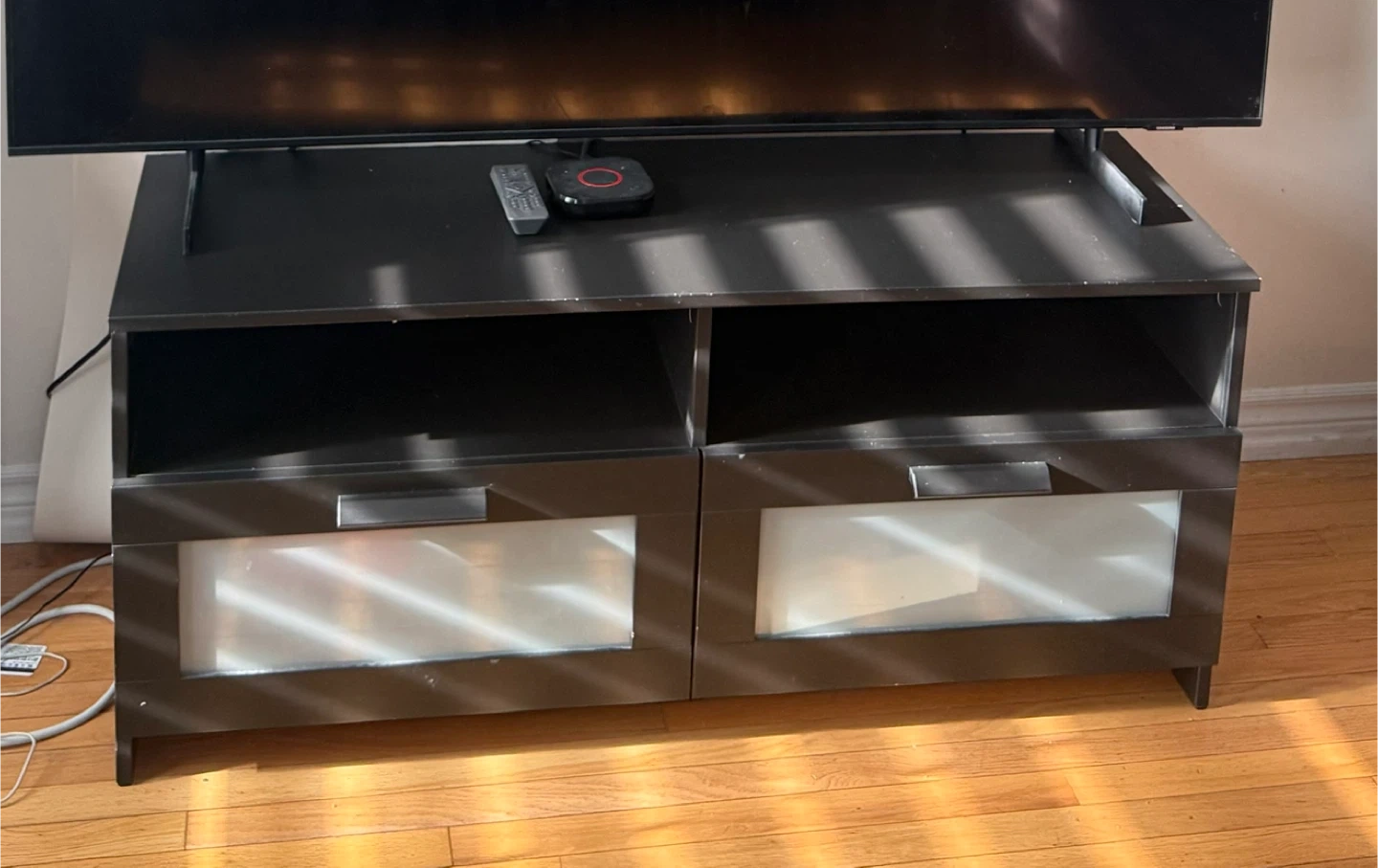 66Selling a black TV stand with two drawers. It's in good condition and provides ample storage space for your media devices and accessories. The drawers slide smoothly and the unit is sturdy. It would be a great addition to any living room or entertainment area!