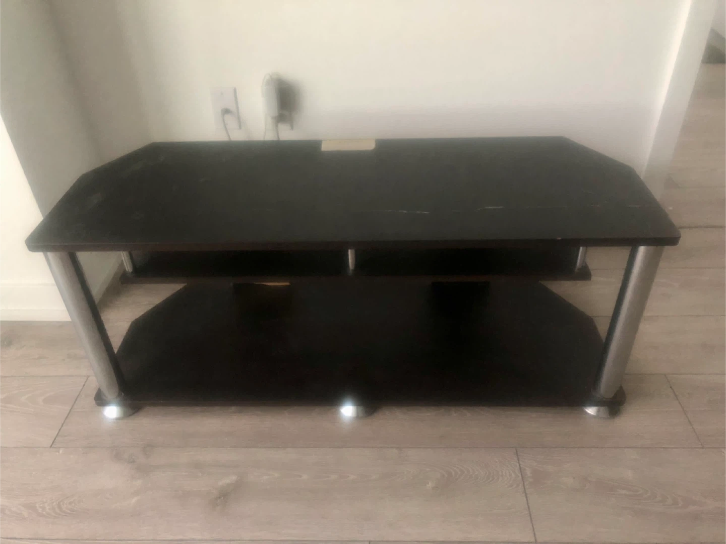 68Selling a black TV stand with shelves. It has a sleek design and is perfect for any living room.