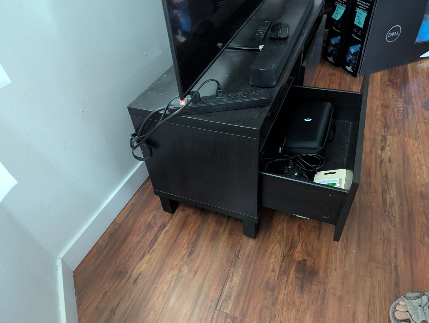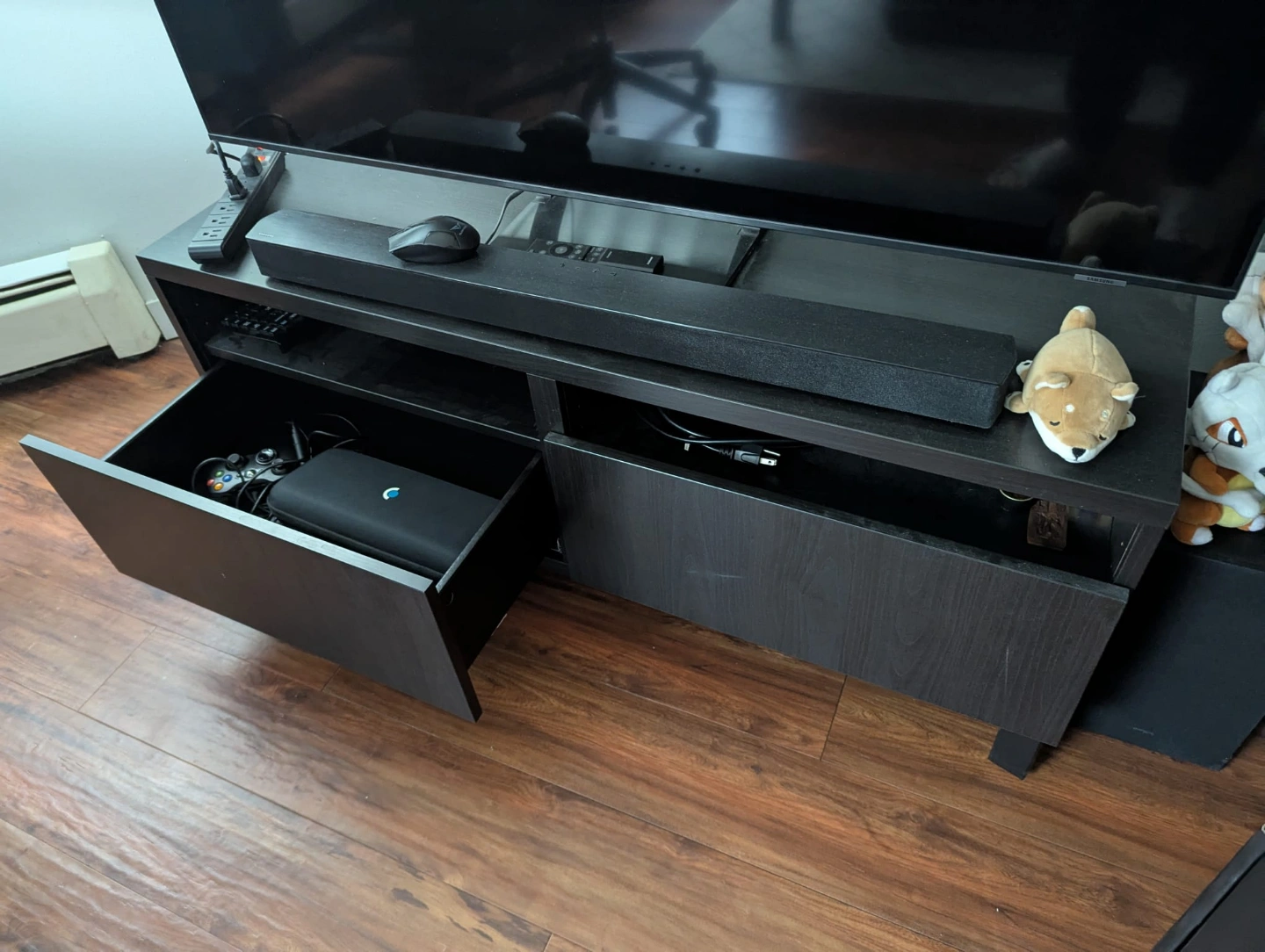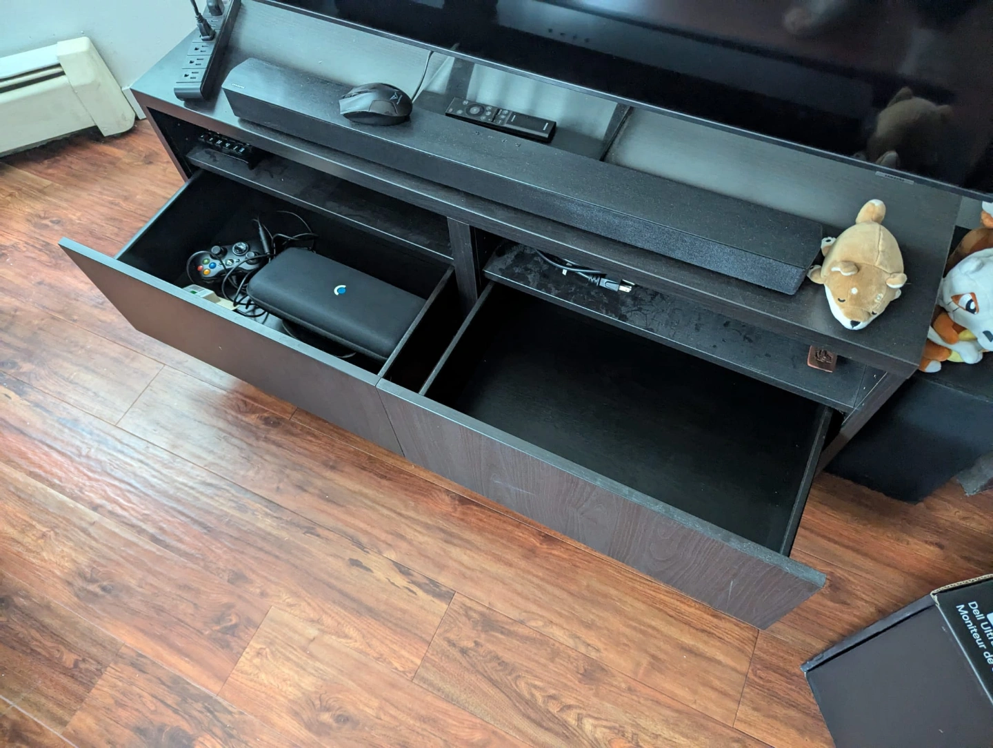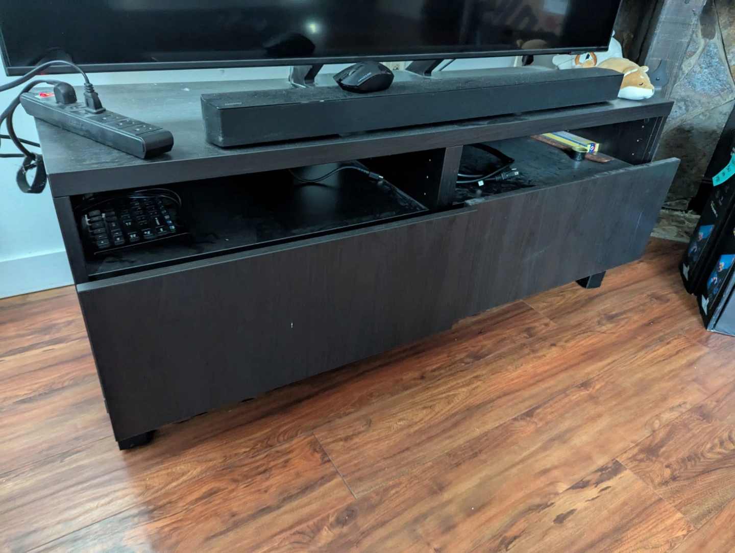 64Ikea BESTÅ TV bench with drawers Dark brown wood-like finish. Two drawers for storage and room on top for tvs/consoles etc. Solid build. Good for living room. Some minor wear. Pick up only in Fairview