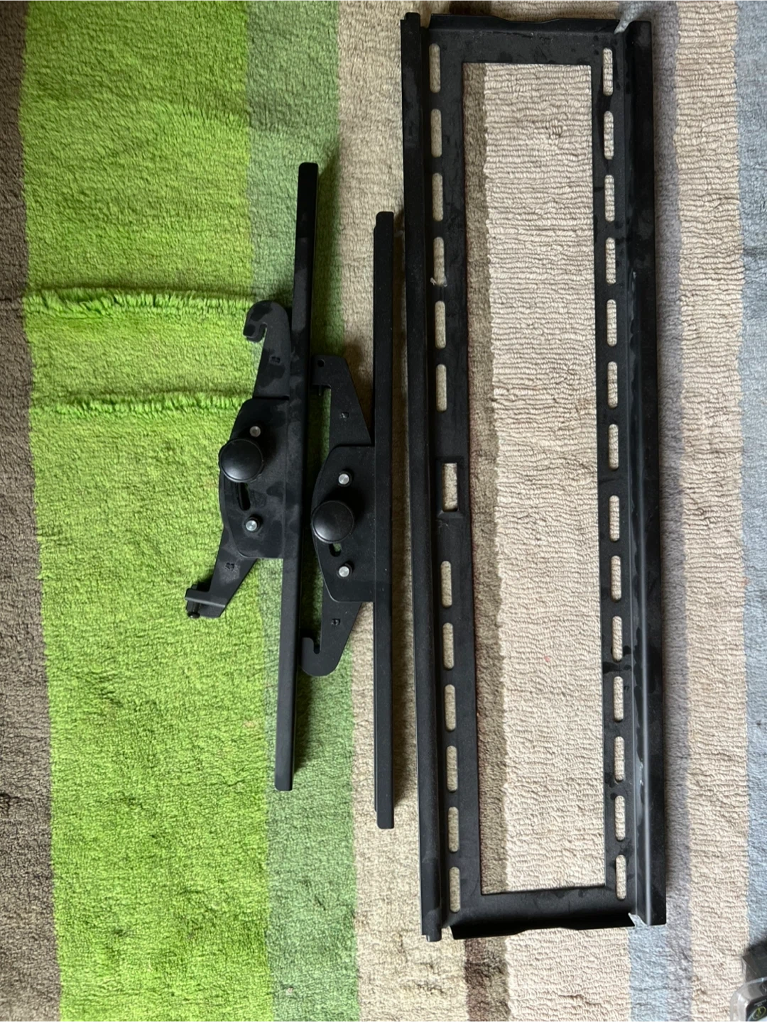 Selling various parts for a black TV wall mount. Includes brackets and mounting hardware. Perfect if you need replacement pieces or are setting up a new entertainment area