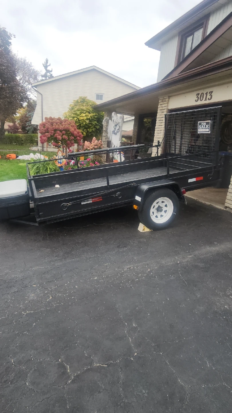 10Selling a black utility trailer. It appears to be in good condition and ready for use. It includes a cage in the back.