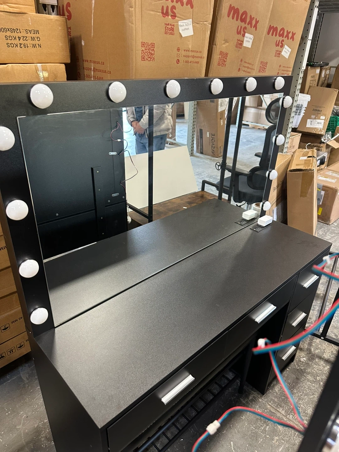 Selling a black vanity makeup table with lights. It has a sleek design and is perfect for creating a dedicated beauty space. The table includes a mirror with built-in lights and drawers for storage. Measurements: 1248x600