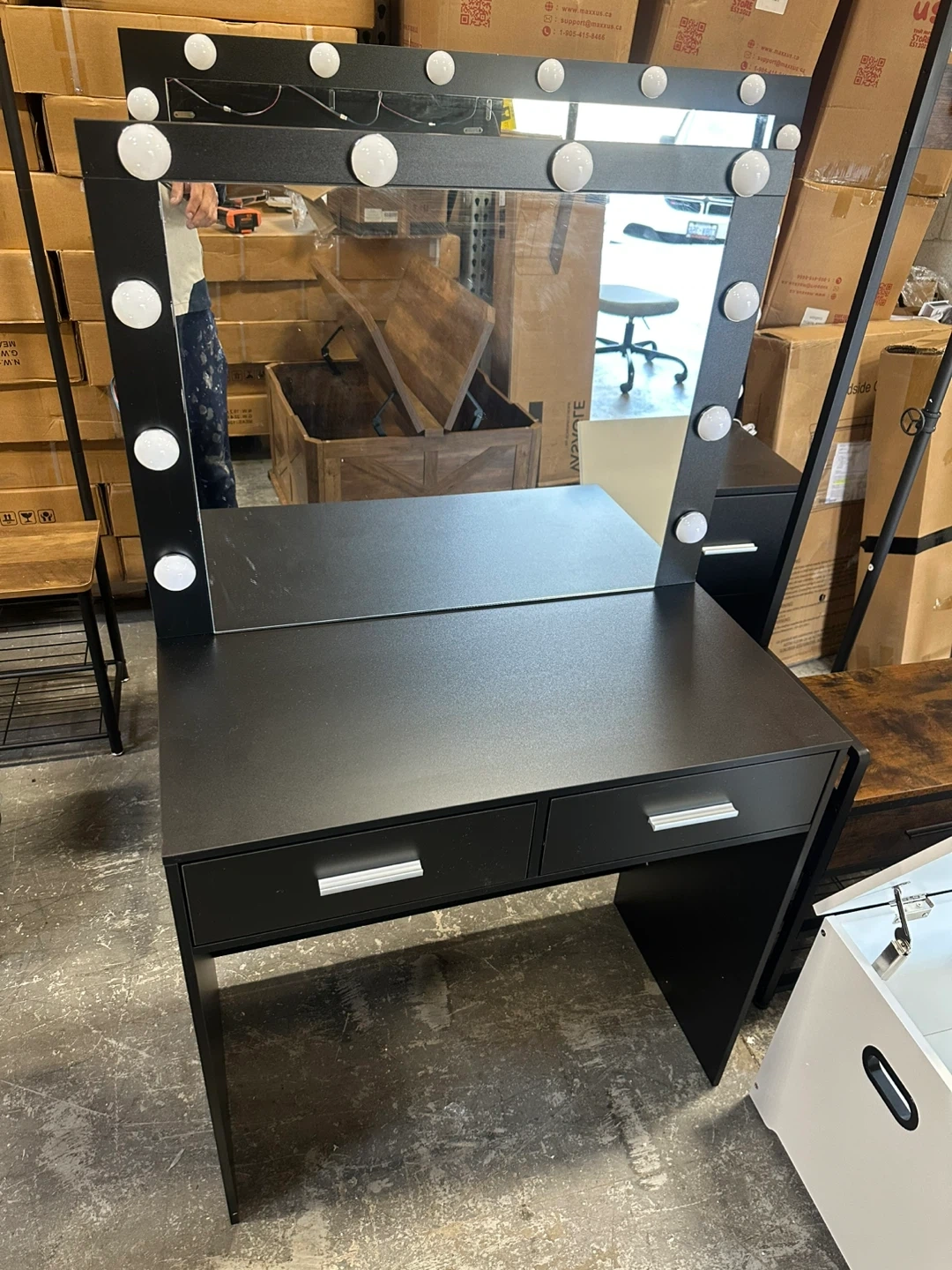 Selling a sleek black vanity makeup table that's perfect for getting ready! It features built-in lights around the mirror to help you get that perfect look. There are also drawers for storage, keeping your makeup and accessories organized and within reach