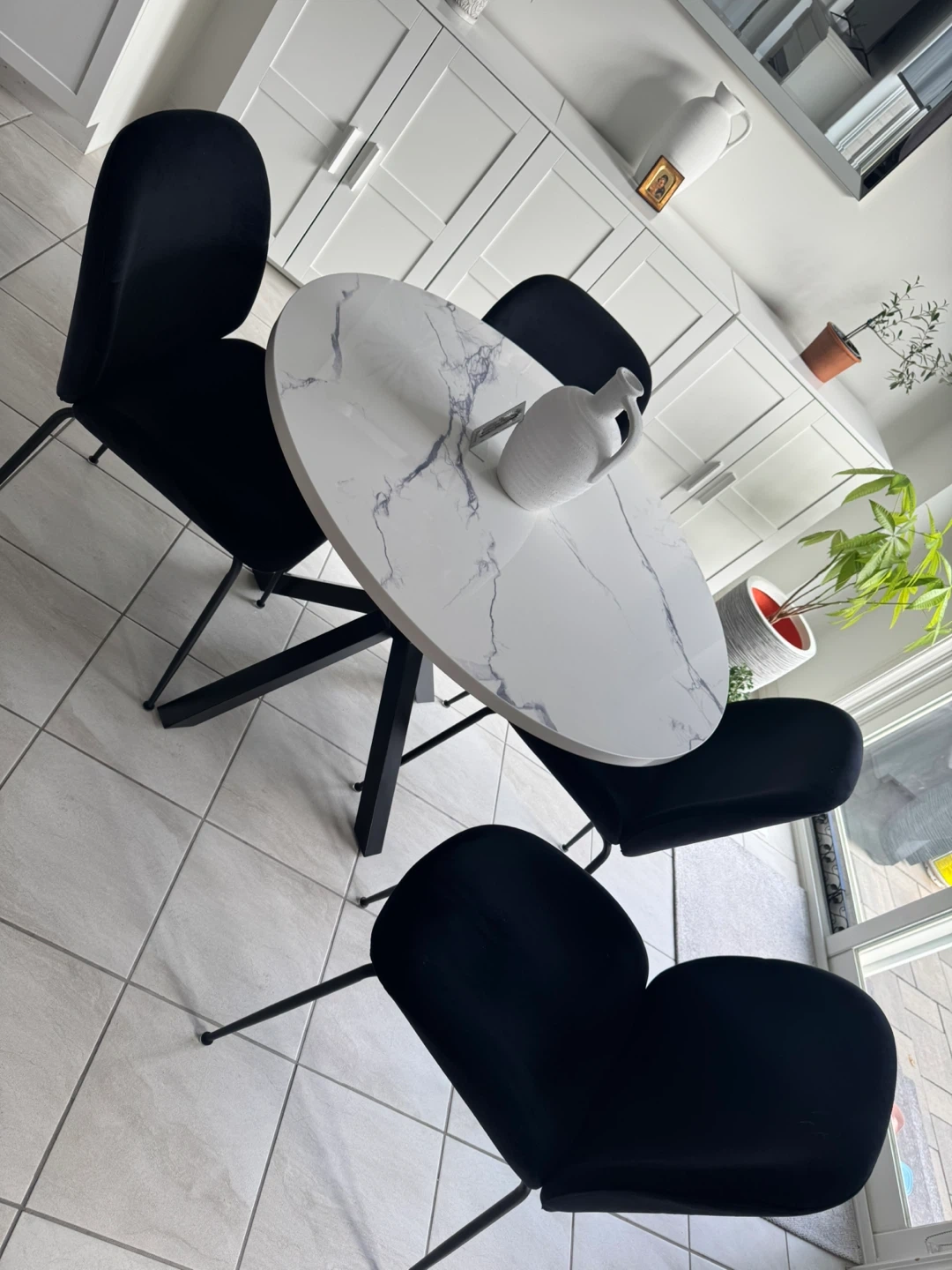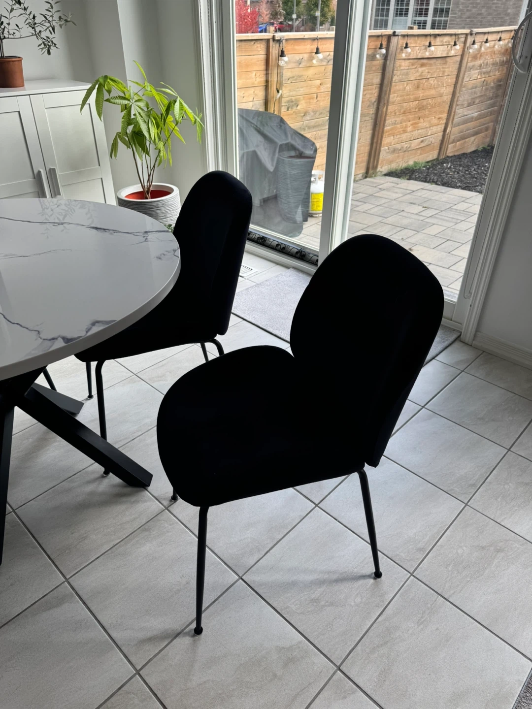 10Selling a set of four stylish dining chairs! They feature a sleek black velvet finish and a modern design that would look great in any dining room or kitchen. The chairs are in great condition and ready for a new home. They're super comfy and add a touch of elegance to your dining space