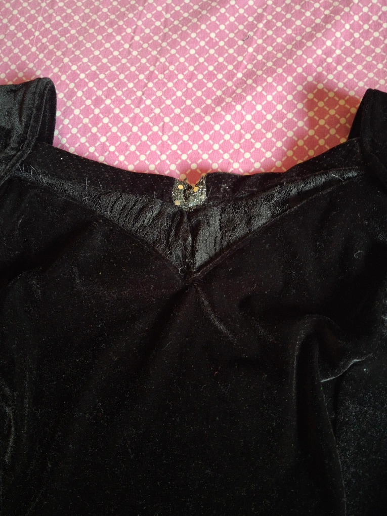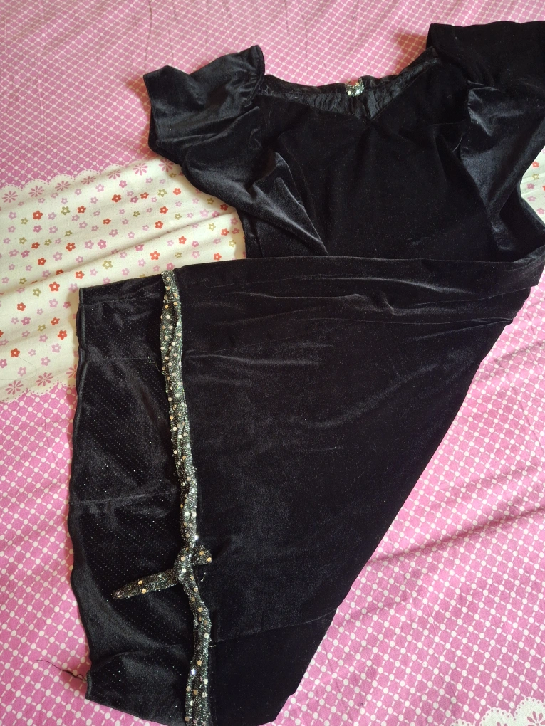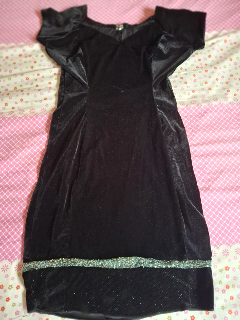 Selling a lovely black velvet dress. It's a beautiful piece with a soft, luxurious feel. The dress features a unique design with some embellishments at the bottom. Perfect for a special occasion or a night out