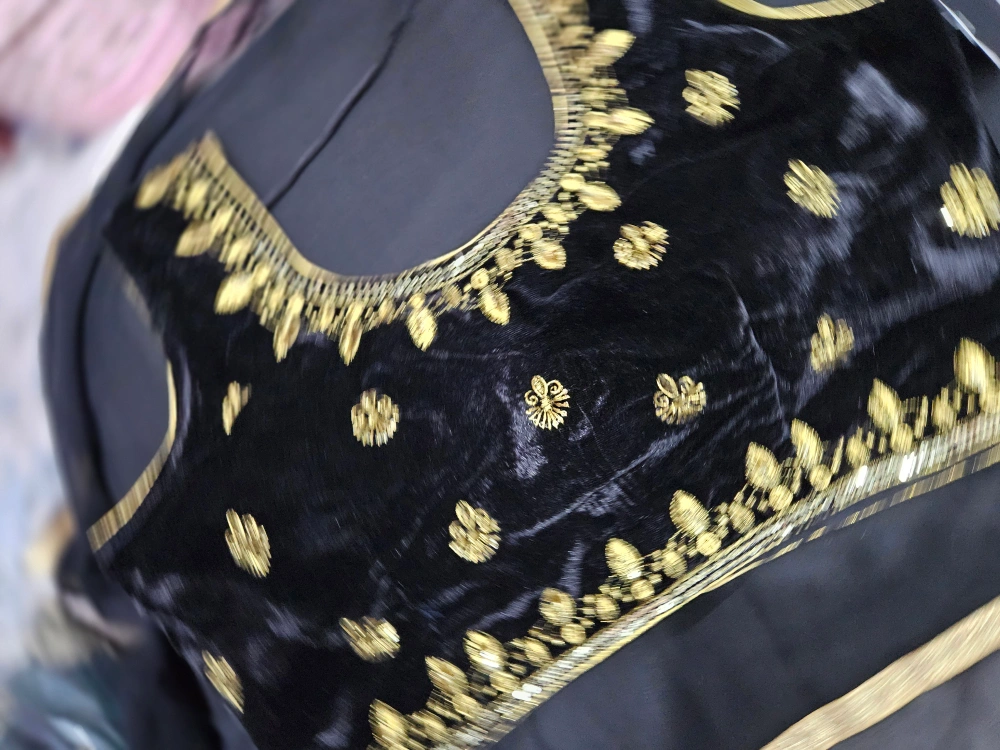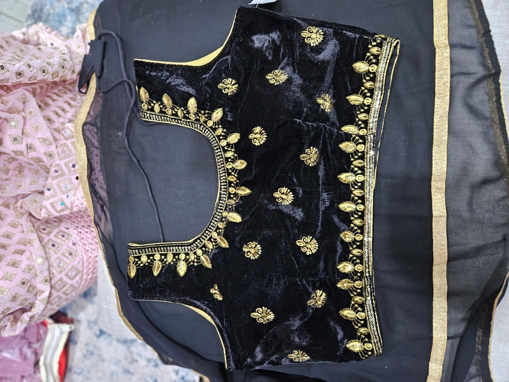 Selling a beautiful black velvet blouse with intricate gold embroidery! The fabric is soft and luxurious, perfect for a special occasion or to dress up any outfit. It's brand new