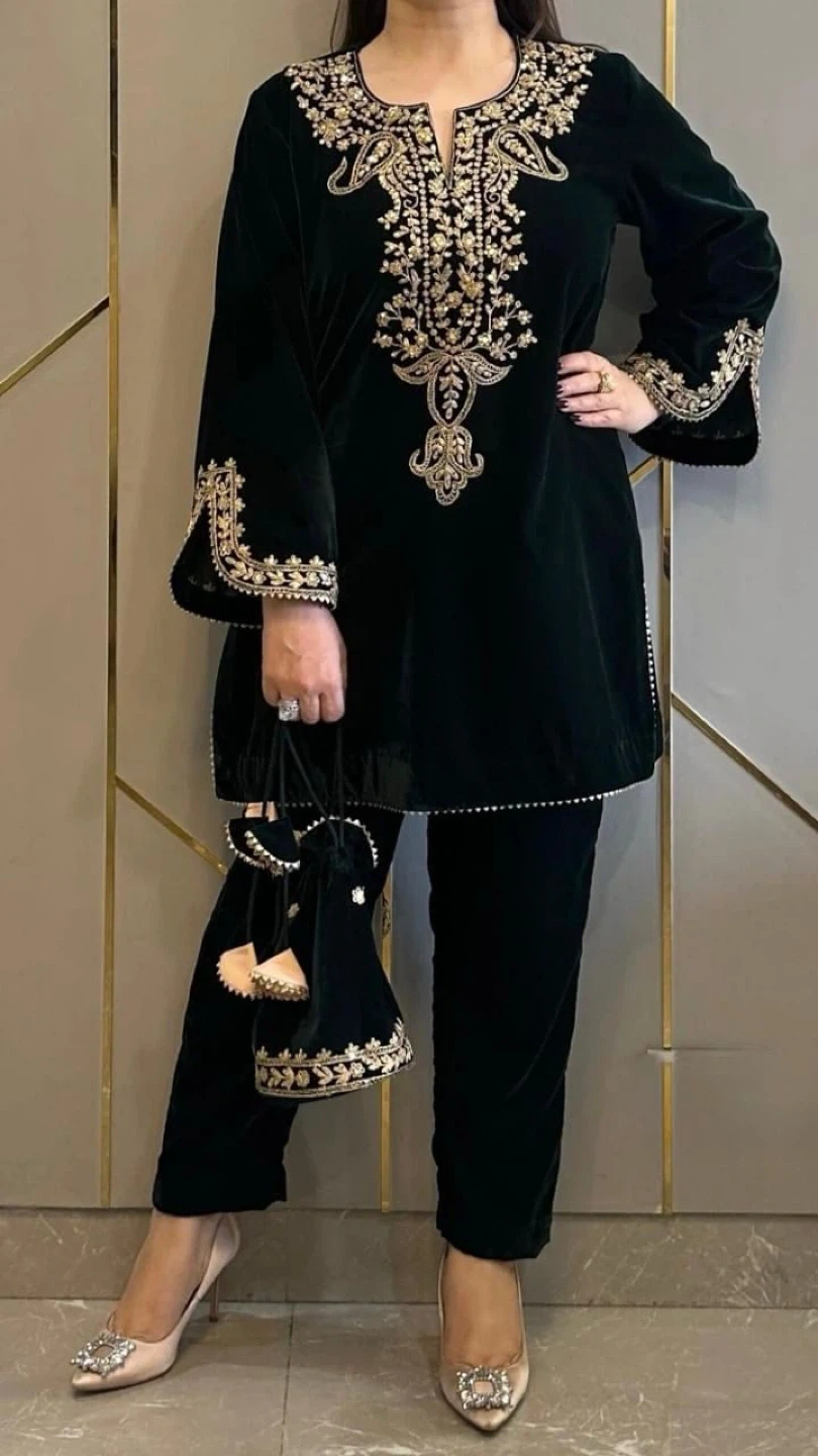 Beautiful black velvet kurti and pant set with intricate gold embroidery. This elegant outfit is perfect for special occasions or adding a touch of luxury to your everyday wardrobe. The soft velvet material feels amazing against the skin, and the detailed embroidery adds a unique and stylish flair
